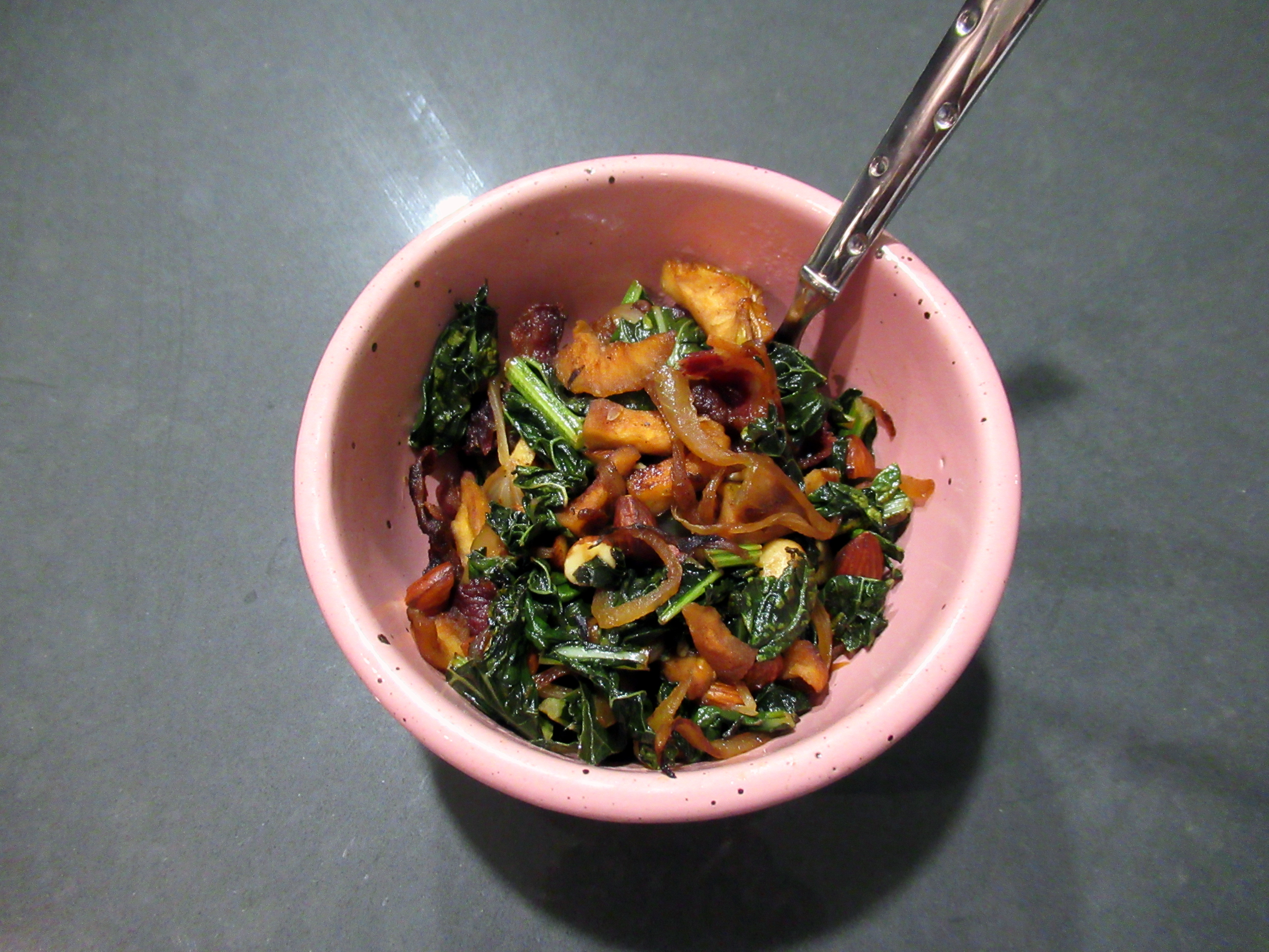Warm kale salads. Sauted lacinato kale with rice vinegar, onion, dried apple, smoked almonds, and beef bacon.