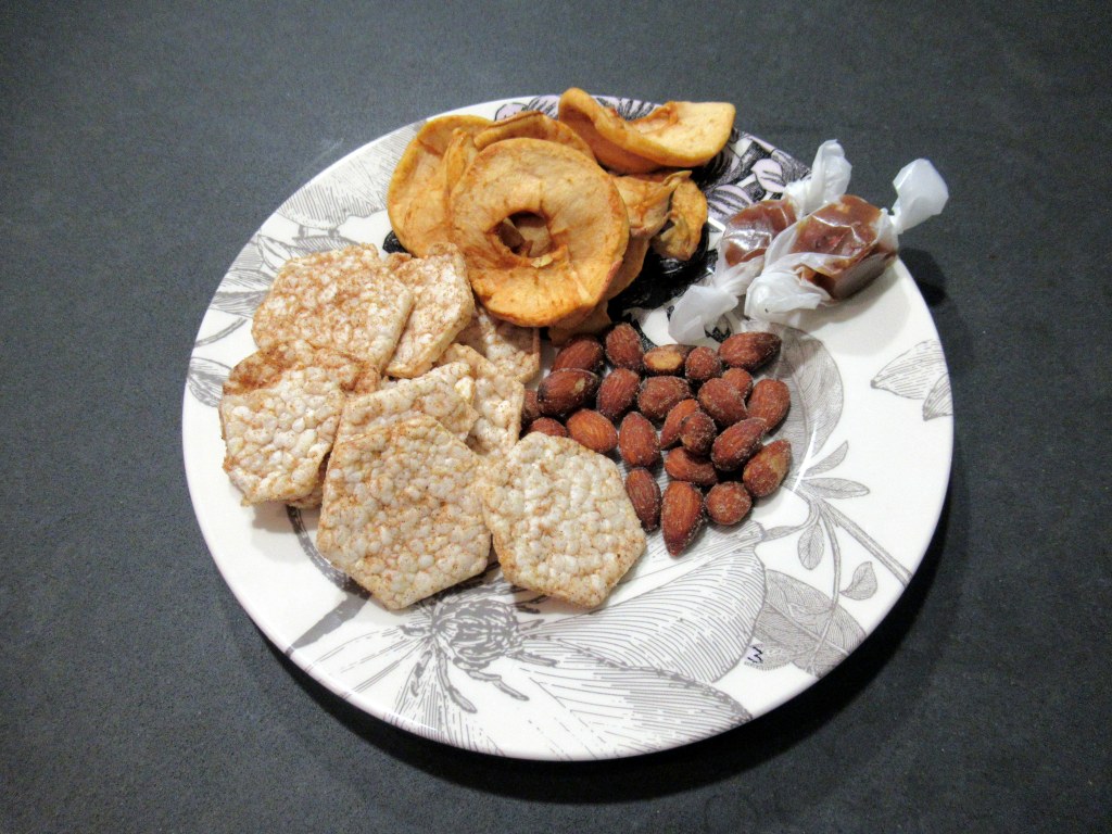 Apple snack plate. Apple pie rice cakes, dried apples, apple cider caramels, and smoked almonds.