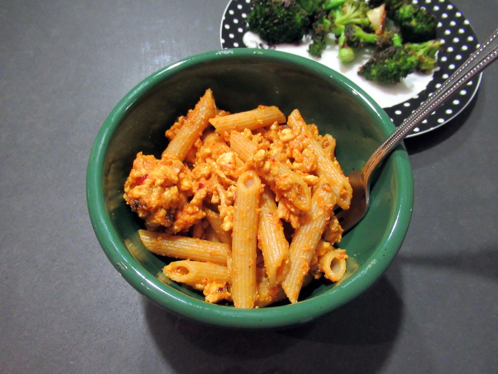 Pumpkin pasta. Ground turkey with pumpkin puree, chili crisp, and sour cream on whole-wheat pasta.
