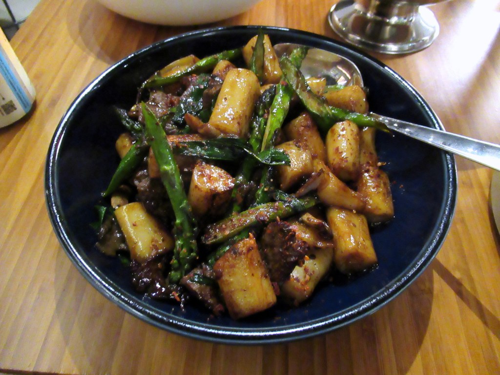Rice roll noodles with oyster mushrooms, asparagus, chives, and hanger steak. <– best dish of the weekend!