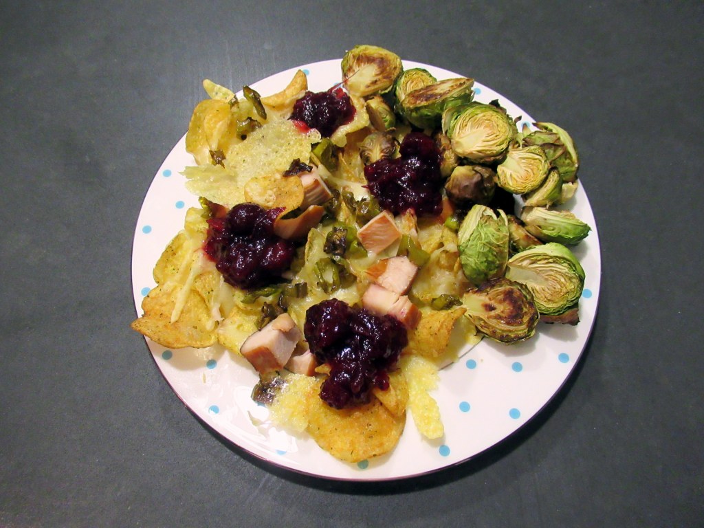 Another round of Thanksgiving nachos. Stuffing chips with swiss/gruyere, shishitos, smoked turkey, and cranberry sauce. Plus roasted brussel sprouts.