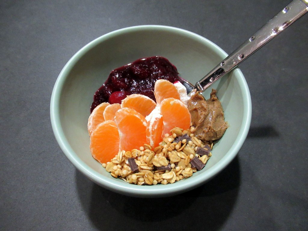 Festive yogurt bowl – plain Greek with tiger syrup, cookie butter, granola, Satsuma mandarins, and cranberry sauce.