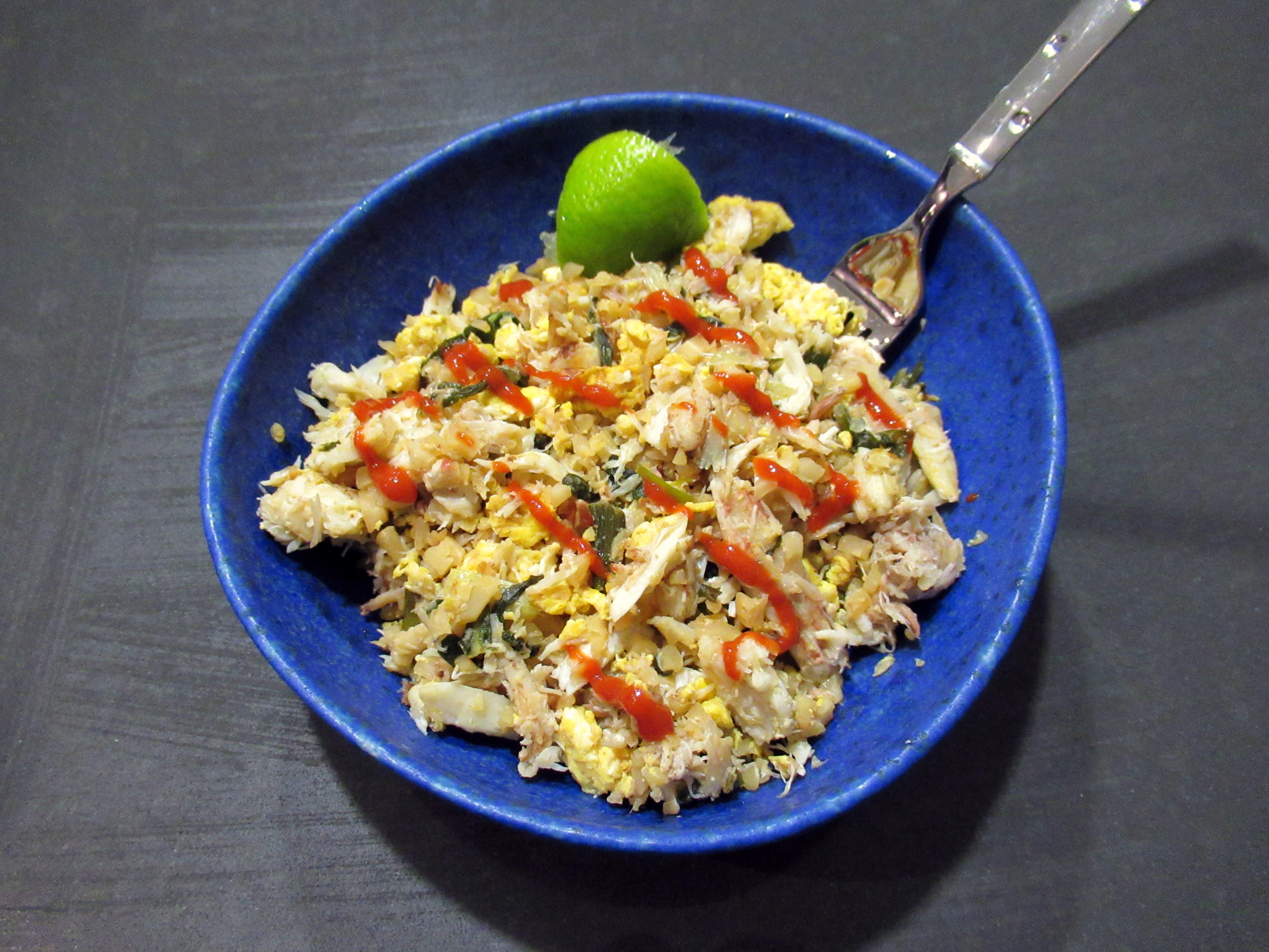 Crab-fried cauliflower rice! I sauteed riced cauliflower, rainbow chard, and green onions with Sriracha, soy sauce, fish sauce, rice vinegar, ginger, and garlic and eggs and loads of blue crab.