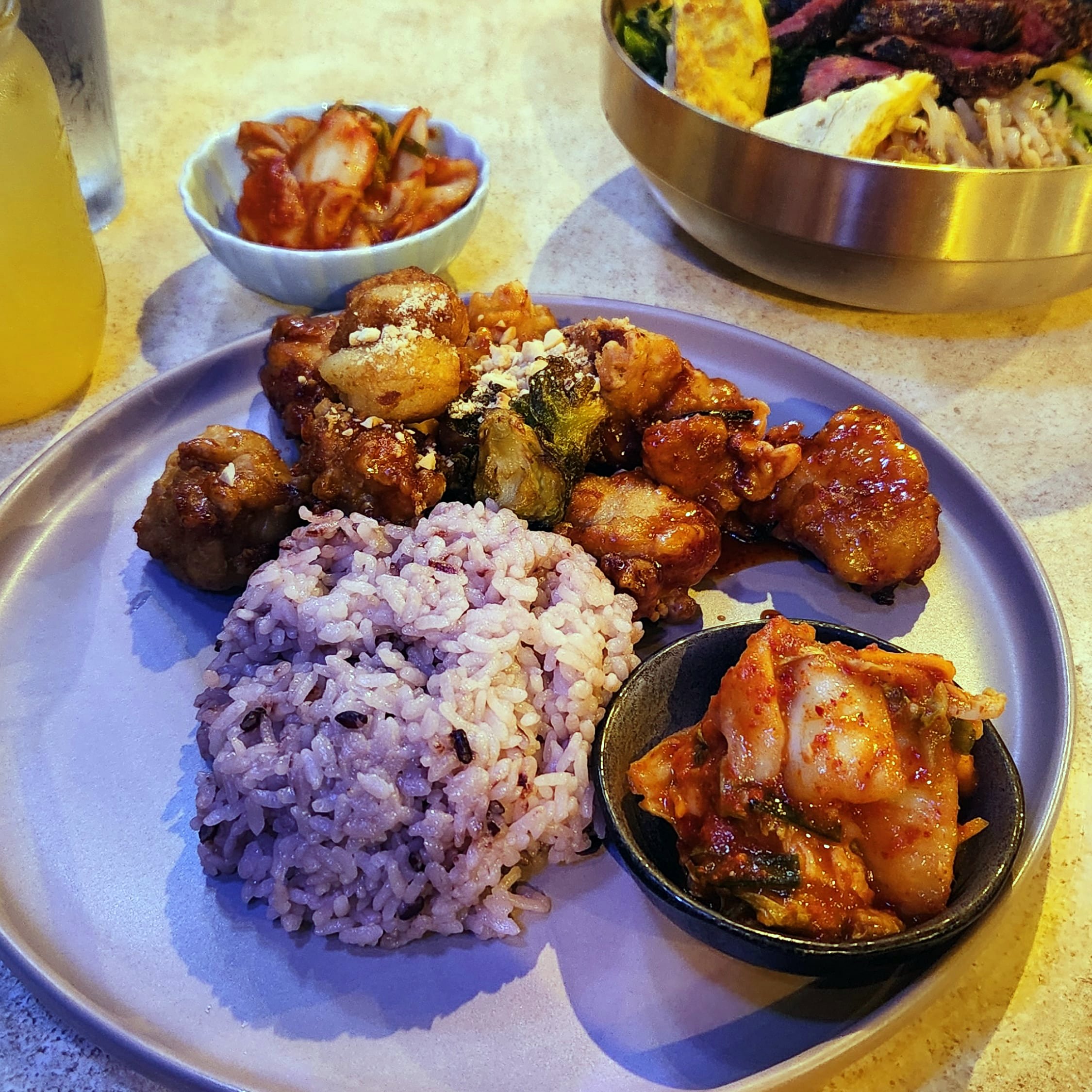 Dinner at O’Kims. Fried chicken and purple rice with the best kimchi I’ve ever eaten.