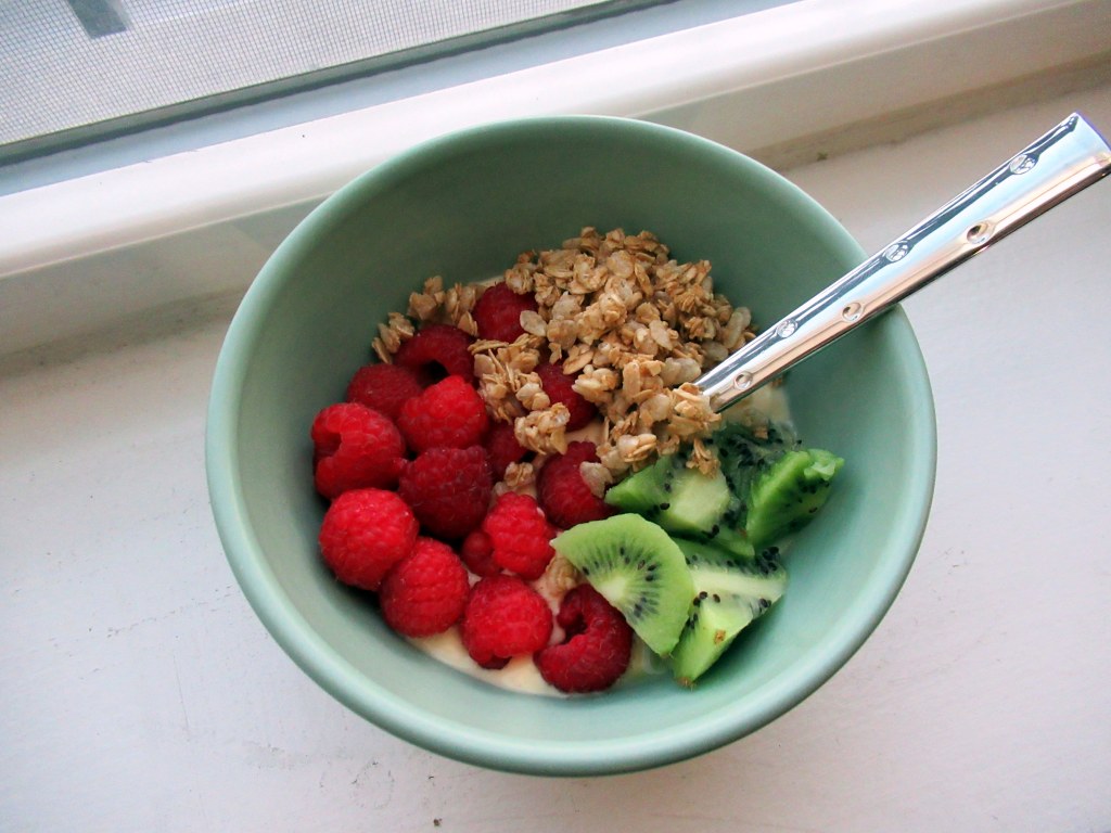Red and green yogurt bowl. Trader Joe’s eggnog Greek yogurt with kiwi, raspberries, and vanilla granola.