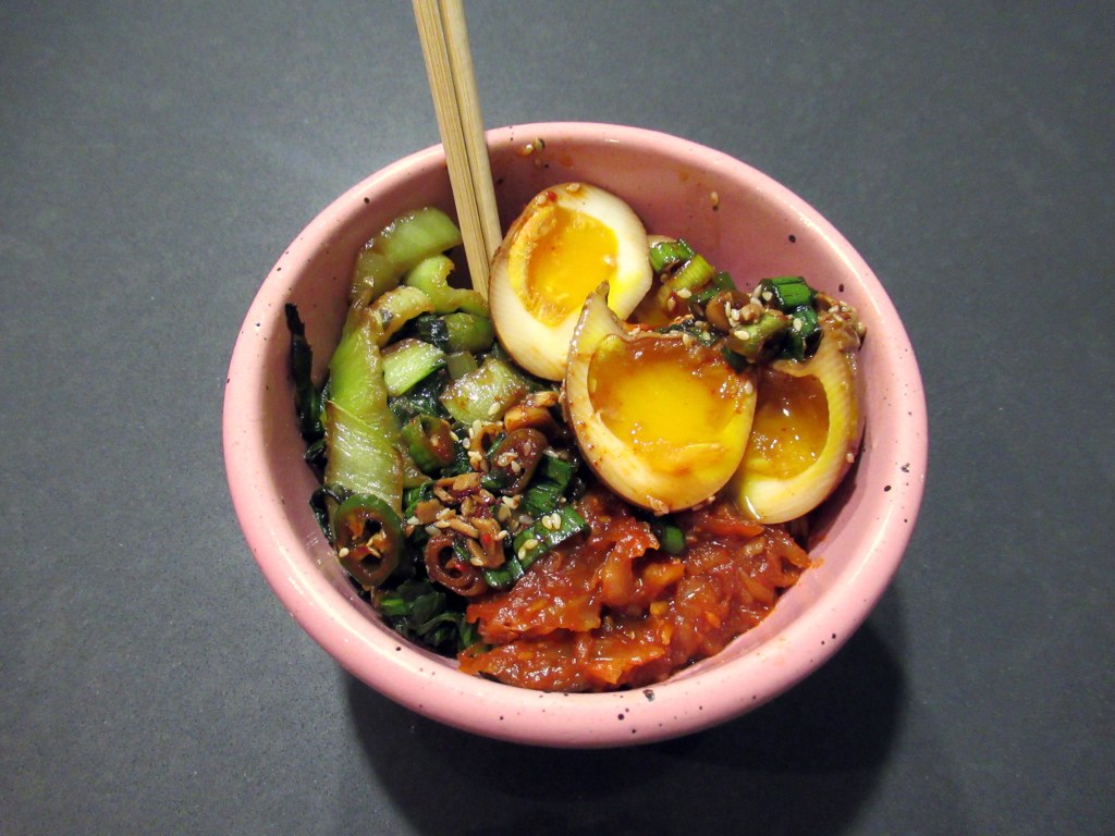 Red and green rice bowls. Brown rice / sauted bok choy / sourkraut sauted with gojuchang and sugar / soy marinated eggs.