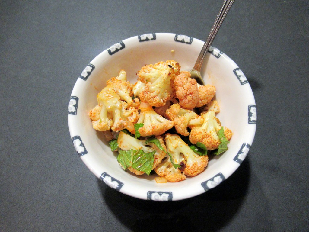 A homecooked dinner. Roasted cauliflower and chopped onion / roasted chickpeas / fresh mint / tossed in honey, rice vinegar, and smoked paprika.