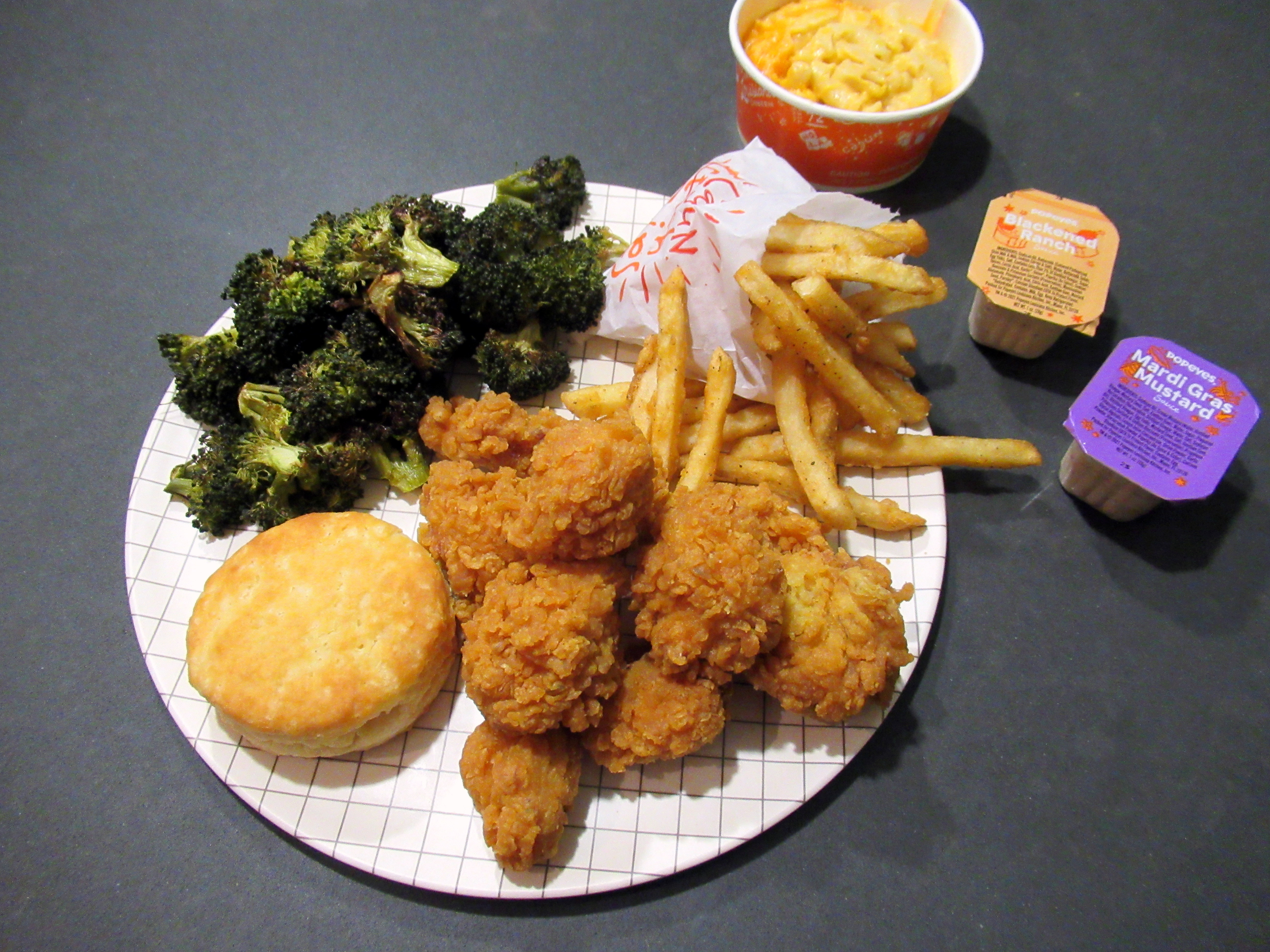 Popeye’s take-out with roasted broccoli from home. Biscuit, fries, nuggets with great sauces, and some of the best mac and cheese I’ve eaten in the States! Is Popeye’s my favorite restaurant? I want to be embarassed to be considering that but I probably should be more embarassed by the fact that this wasn’t the only time I ordered this this week!! The nuggets are shockingly good leftover.
