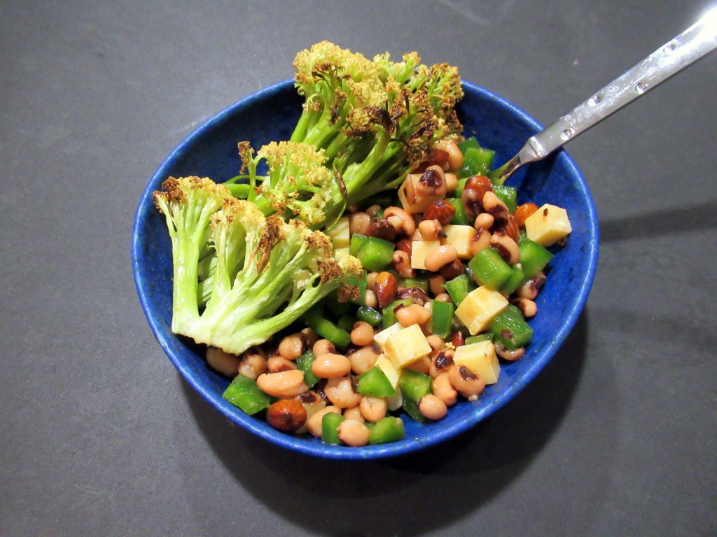 Our favorite black-eyed-pea salad. With Kerrygold Dubliner cheese, Crystal hot sauce, and diced green bell pepper. Plus some roasted baby cauliflower.