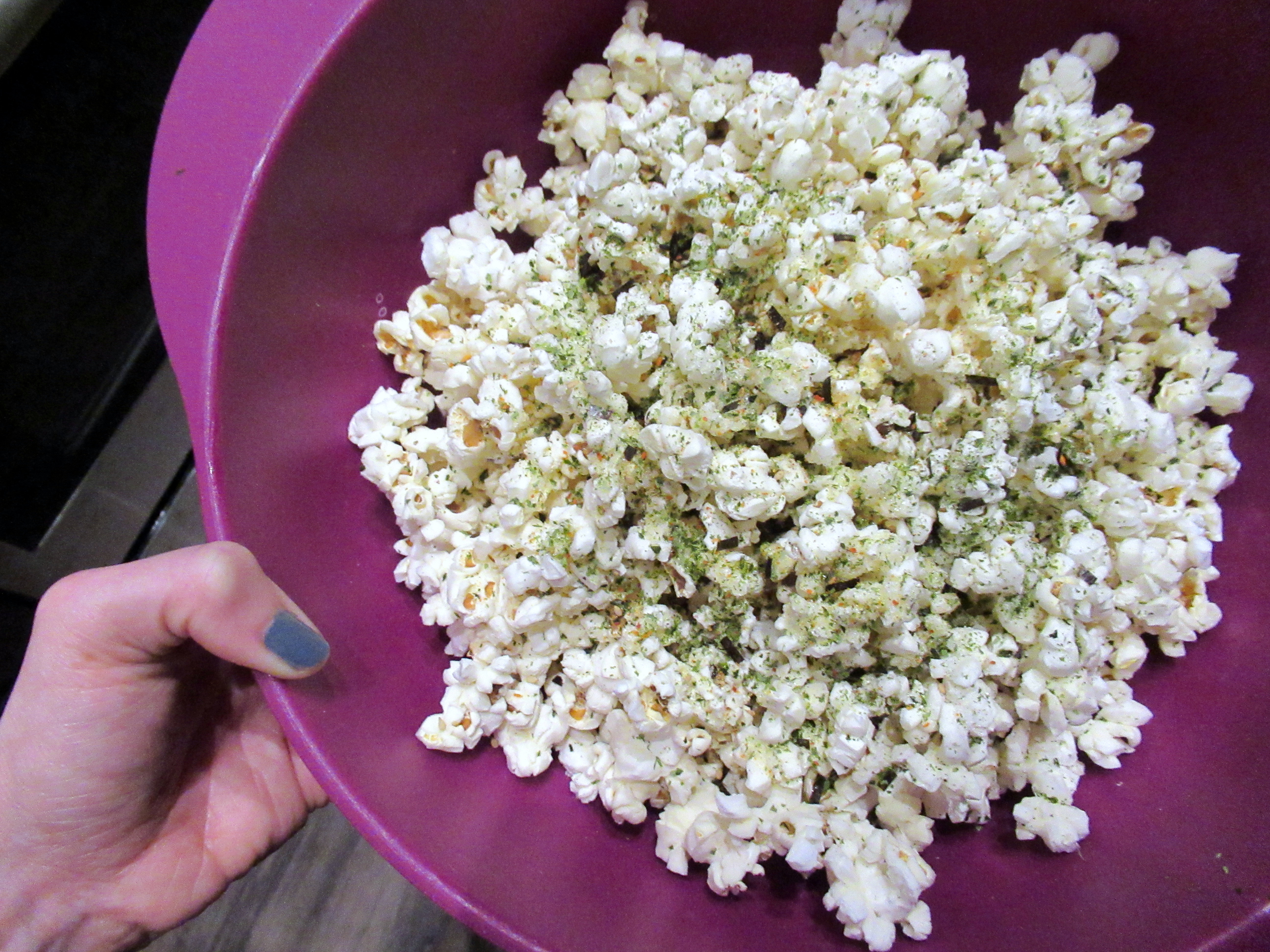 Homemade popcorn with butter, furikake, togarashi, white sesame seeds, and salt/sugar.