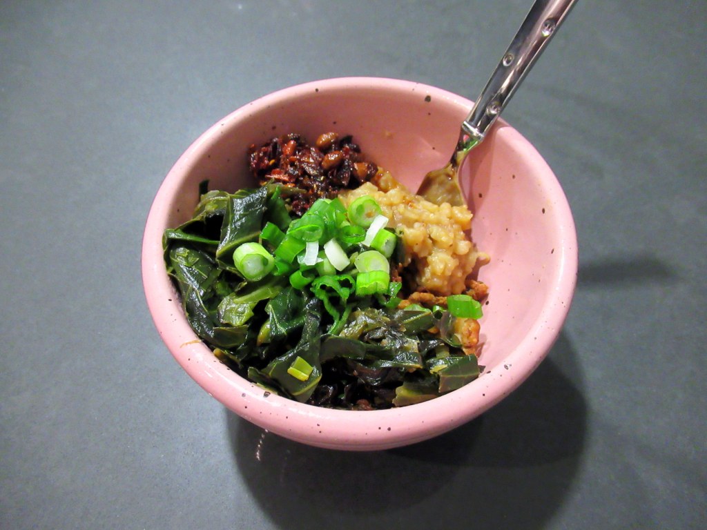 Congee (brown rice cooked for an hour and a half in turkey stock) / layered with collard greens sauteed with green onion and ginger / and ground turkey sauteed with white onion, garlic, and Korean pepper / topped with chili crisp and green onions.