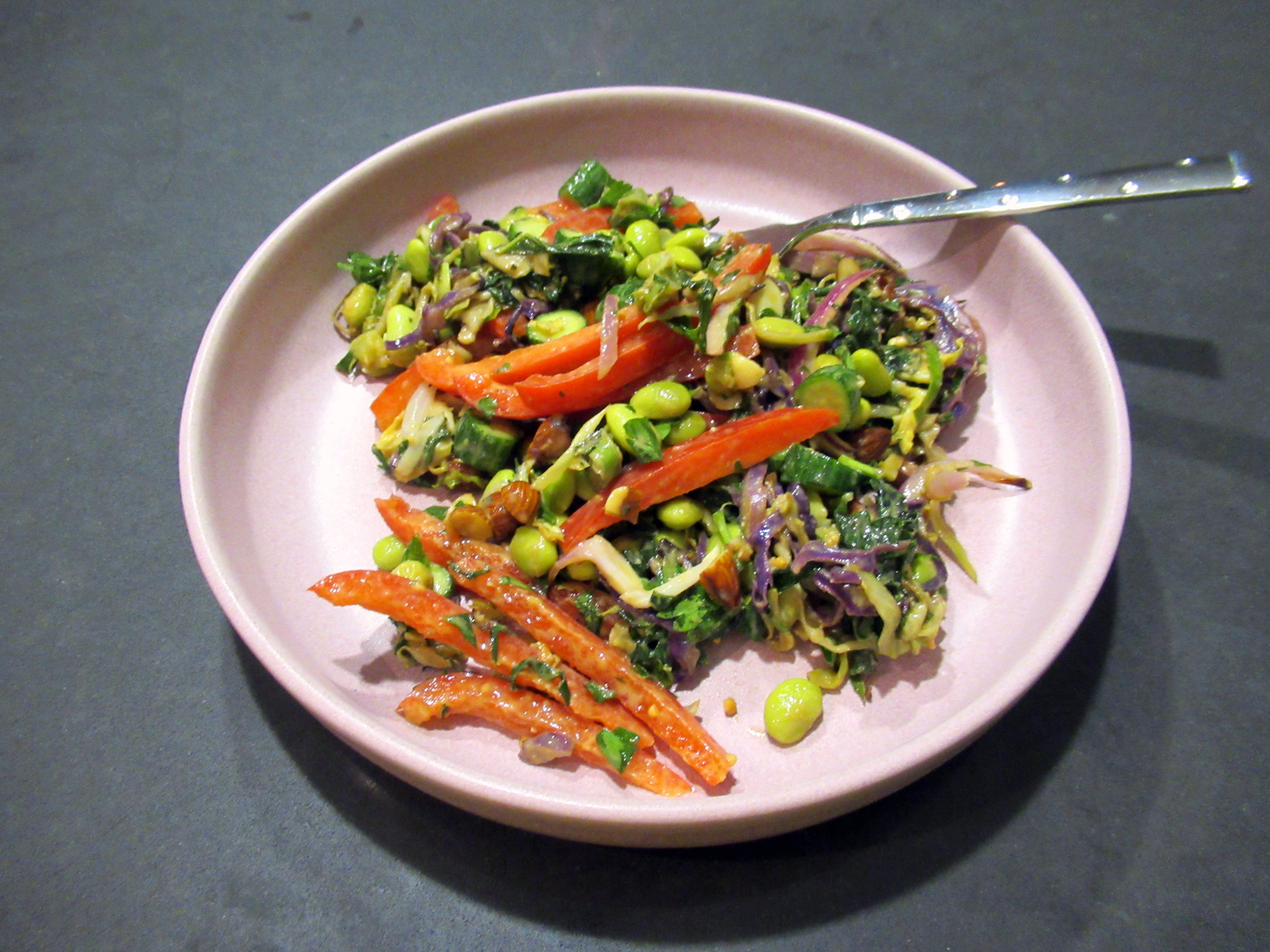 Veggie bowls. Roasted Trader Joe’s Cruciferous Crunch mix and red onion / red bell pepper, chopped baby cucumber, and edamame / chopped smoked almonds / sauce – crunchy peanut butter, miso paste, soy sauce, maple, lemon juice.