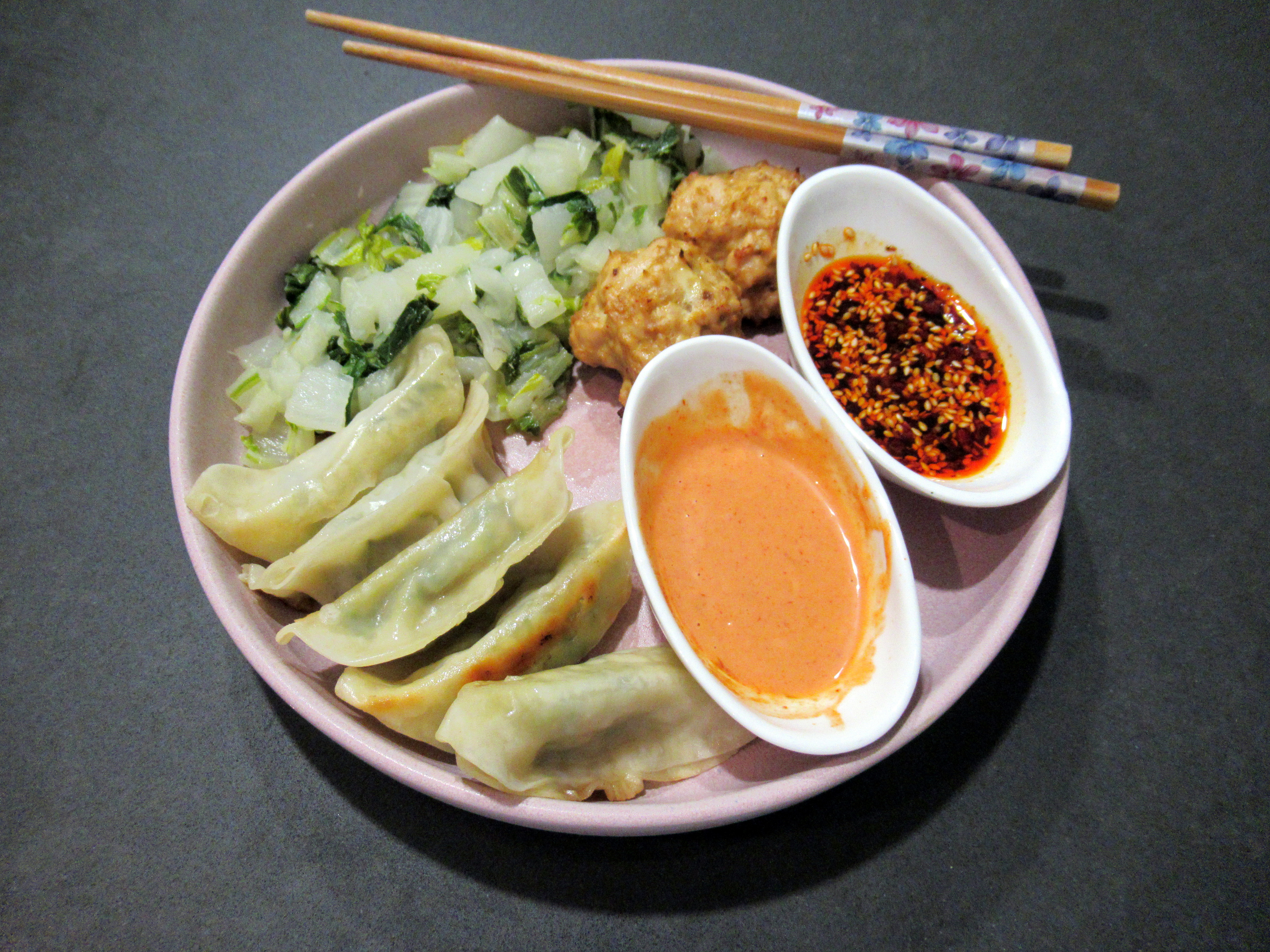 Best meal of the week – Trader Joe’s Thai Vegetable Gyoza (yum!) / sauteed bok choy / homemade turkey meatballs with panade, hoisin, and gojuchang / homemade Sriracha mayo and dumpling sauce (yum!).