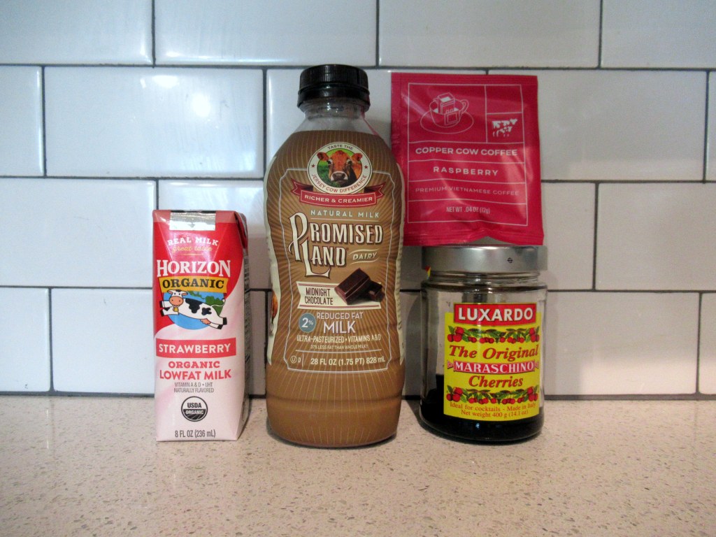 An array of pink and/or chocolate-covered-berry coffees. Strawberry milk with espresso and mocha / raspberry pour-over with chocolate milk / iced coffee with chocolate milk and Luxardo cherry.