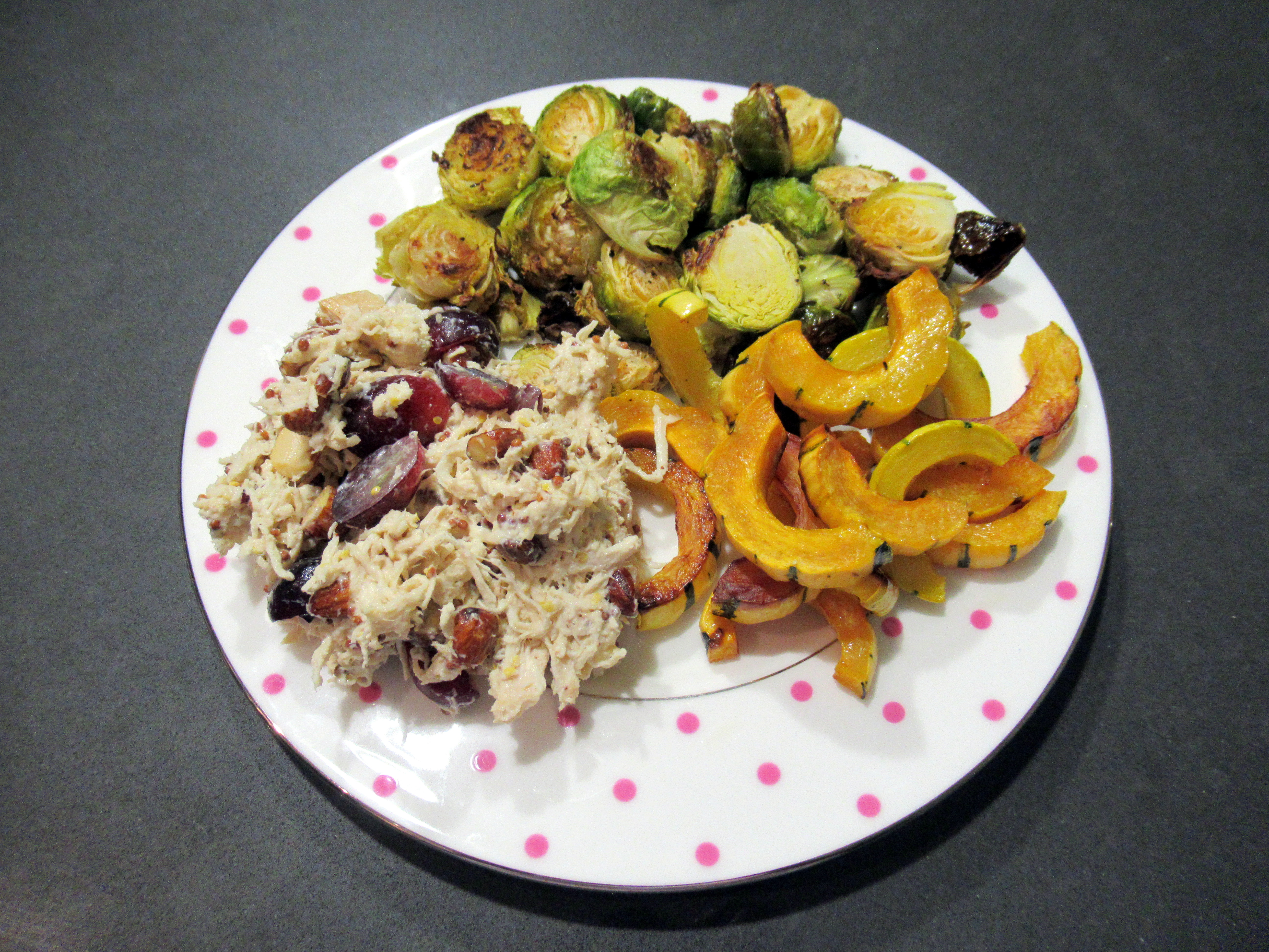 We loved this cozy dinner. Chicken salad with Candy Snap grapes and smoked almonds / roasted brussel sprouts / roasted delicata squash.