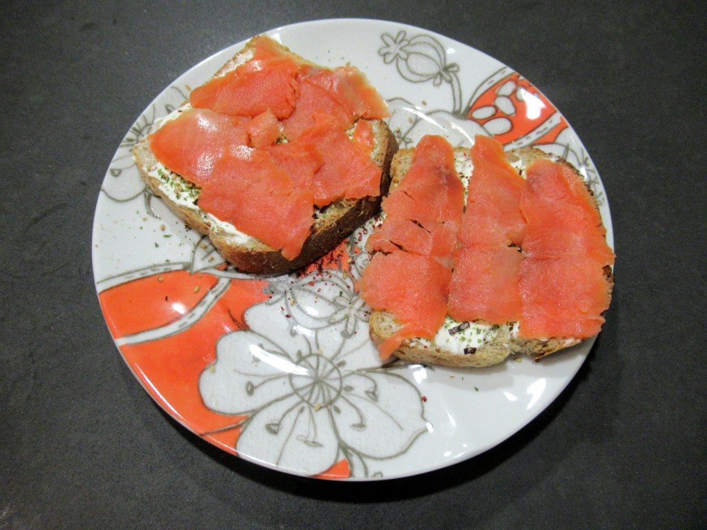 Easy lox toasts. Toasted rye with butter, cream cheese, furikake, gochugaru, and smoked sockeye salmon.