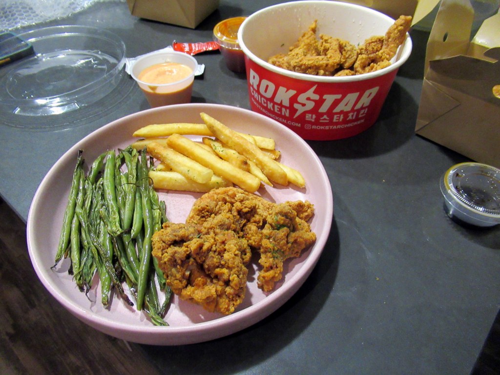 We got great take-out from Rokstar Chicken. Their new honey butter boneless chicken plus truffle fries plus roasted green beans from home. Also – for dessert we got their cream cheese bites and they were chewy and wonderful!