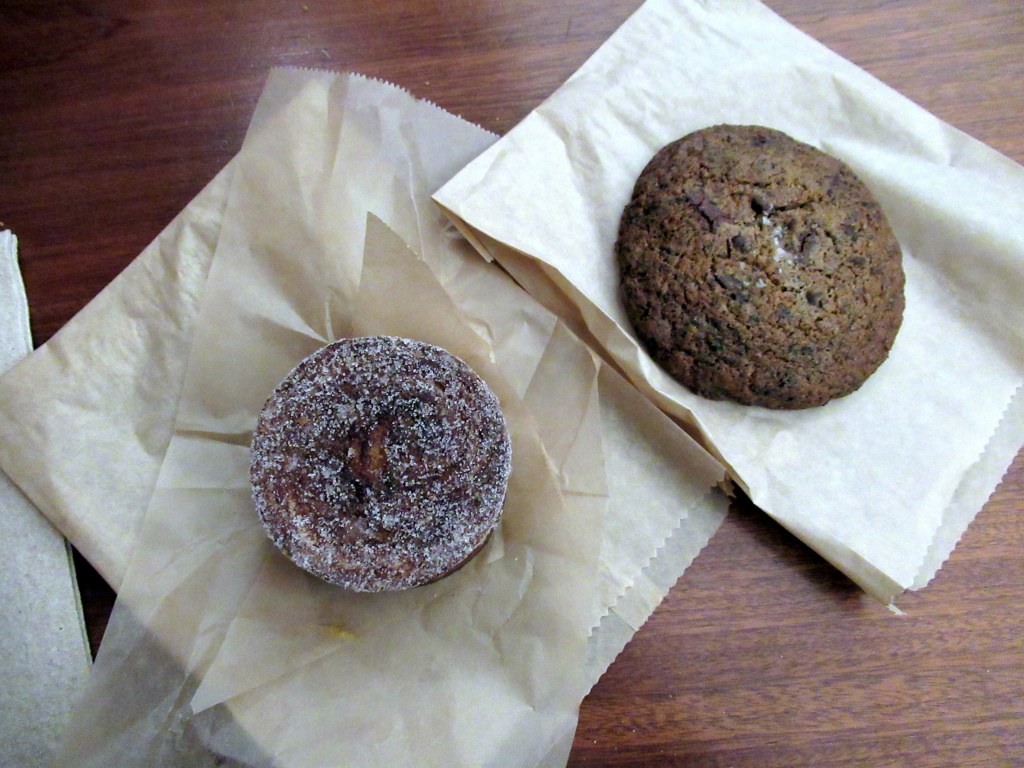 Some treats from Frenchette. A buckwheat chocolate chip cookie plus their pastry stuffed with blood orange curd.