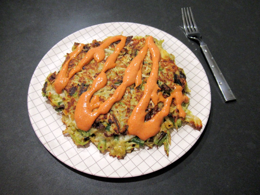Reuben sandwich inspired okonomiyaki. Shredded yellow potato (squeezed as dry as possible and microwaved for three minutes) / shredded cabbage and chopped green onion (baked for 20 minutes) / in a batter with minced ginger, white pepper, salt, gochugaru, eggs, flour, and ginger seltzer / stuffed with sliced roast beef and Jarlsberg / then cooked in a wide pan in canola oil / topped with homemade Russian dressing.