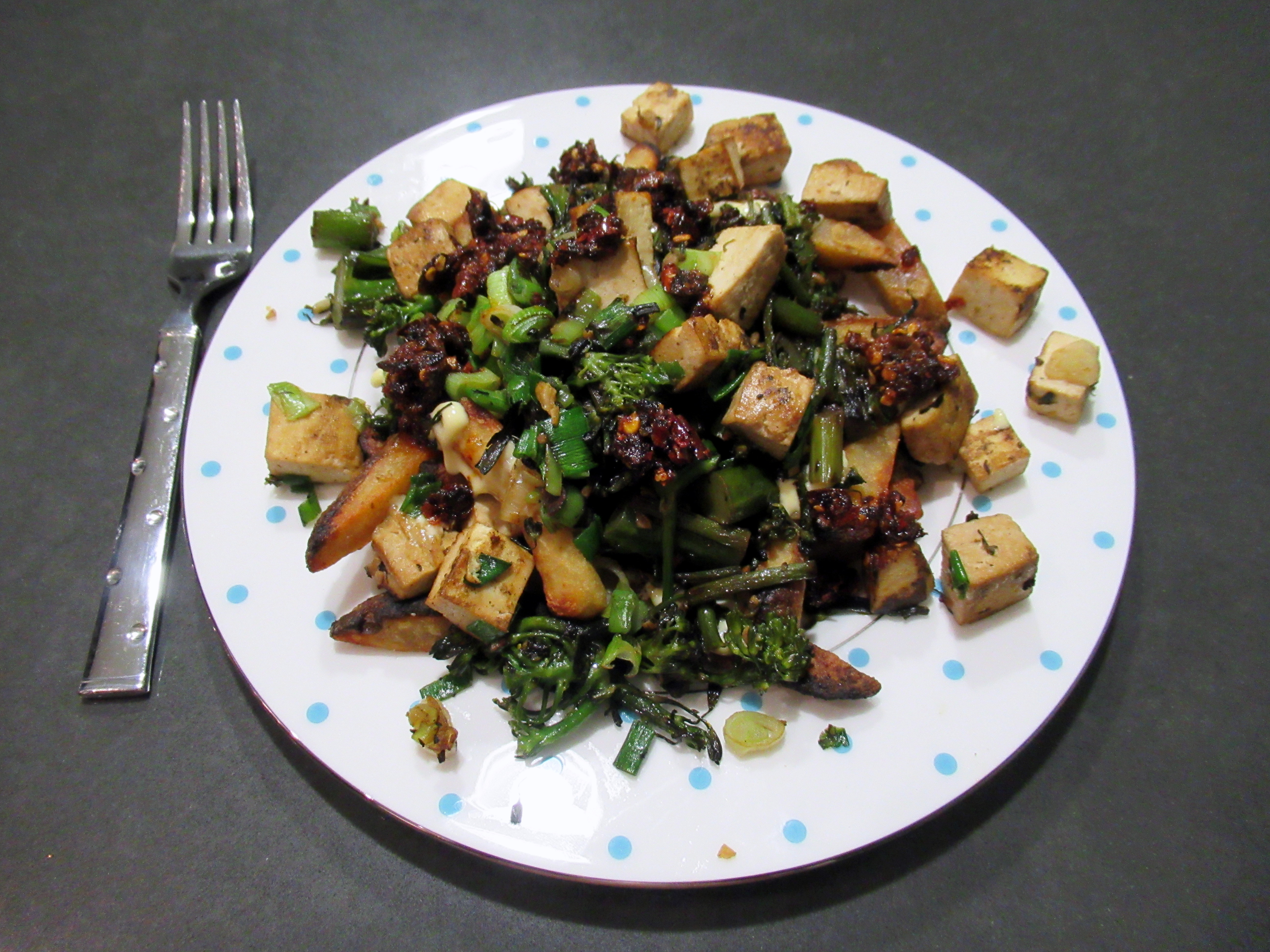 I turned my leftover Pecking House chicken-seasoned fries into something amazing. Leftover fries crisped under the broiler / Kewpie mayo / baby broccoli sauted with tons of garlic / Trader Joe’s teriyaki baked tofu / chili crisp.