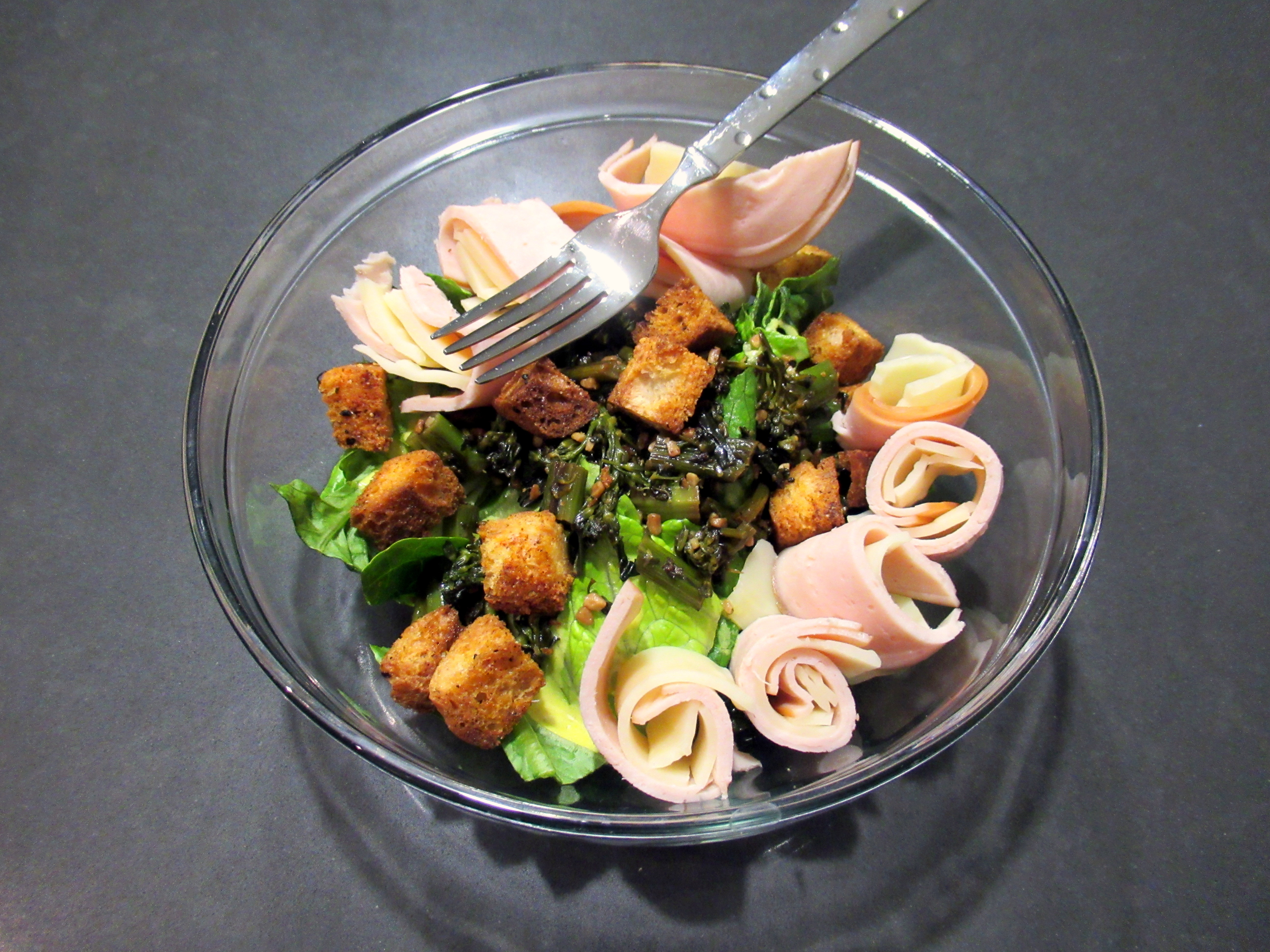 Cuban sandwich inspired salads. Romaine / leftover garlic broccoli / homemade yellow mustard vinaigrette (equal parts mustard, mayo, vinegar, olive oil, and lemon juice, plus a pinch of salt) / homemade croutons / Jarlsberg cheese and sliced pork for Adam and smoked turkey for me. I forgot the chopped pickles, which is devestating, but this was still a fantastic salad.