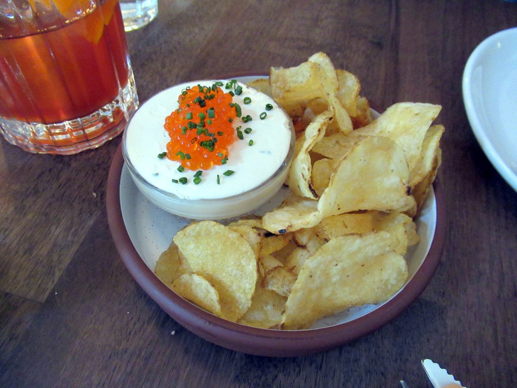 French onion and crème fraîche dip with potato chips and trout roe.