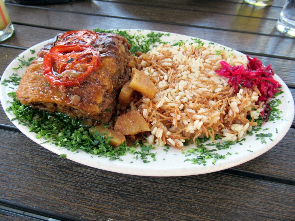 I got the baked eggplant with tomato, almonds, and ground lamb.