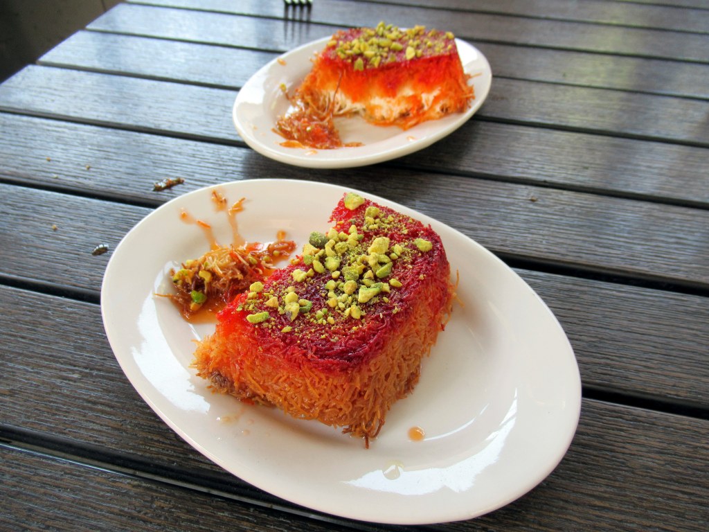 Knafeh – crispy filo dough with sweet cheese and orange blossom syrup.