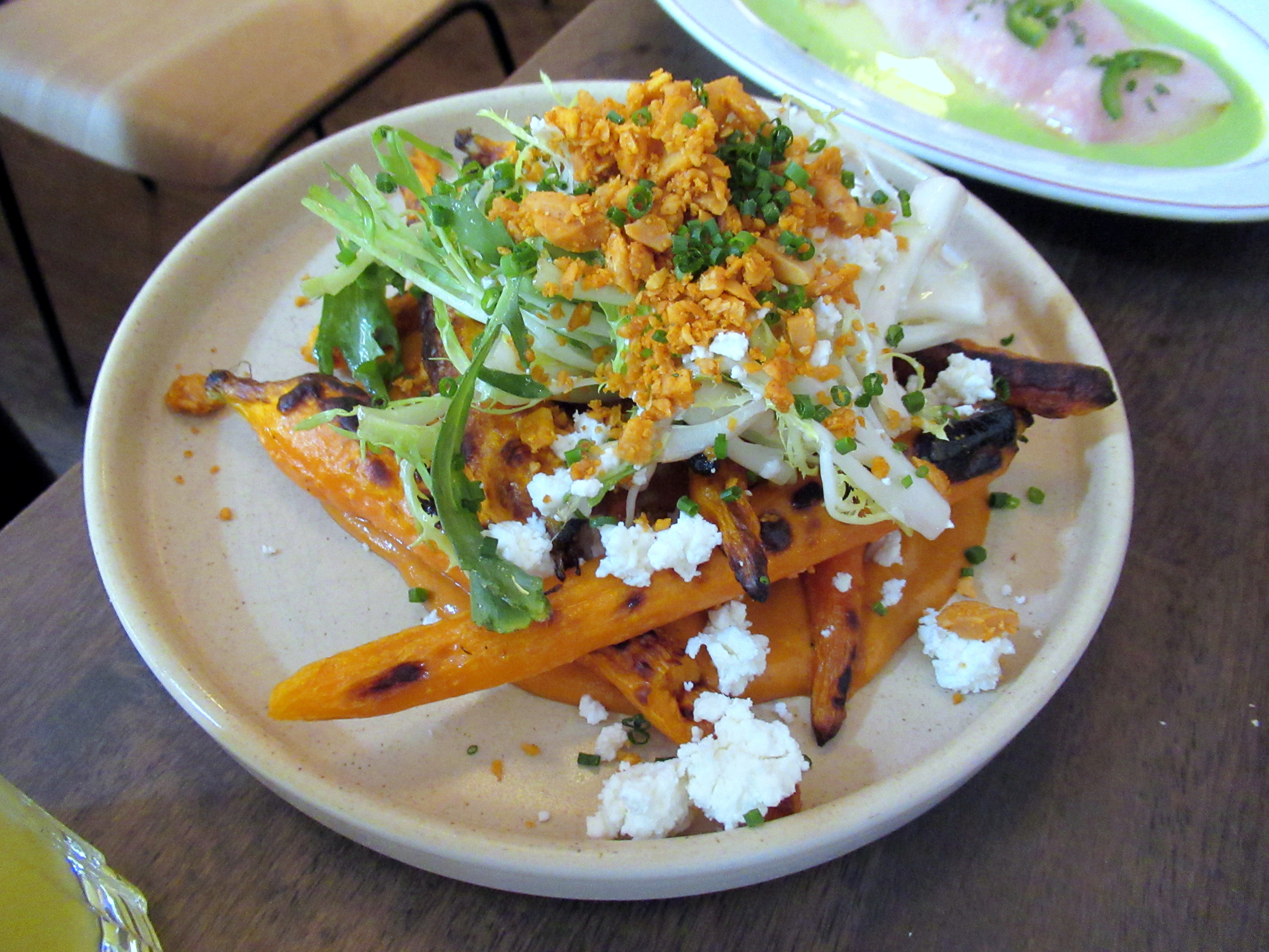 Roasted carrots with almond romanesco and goat cheese.