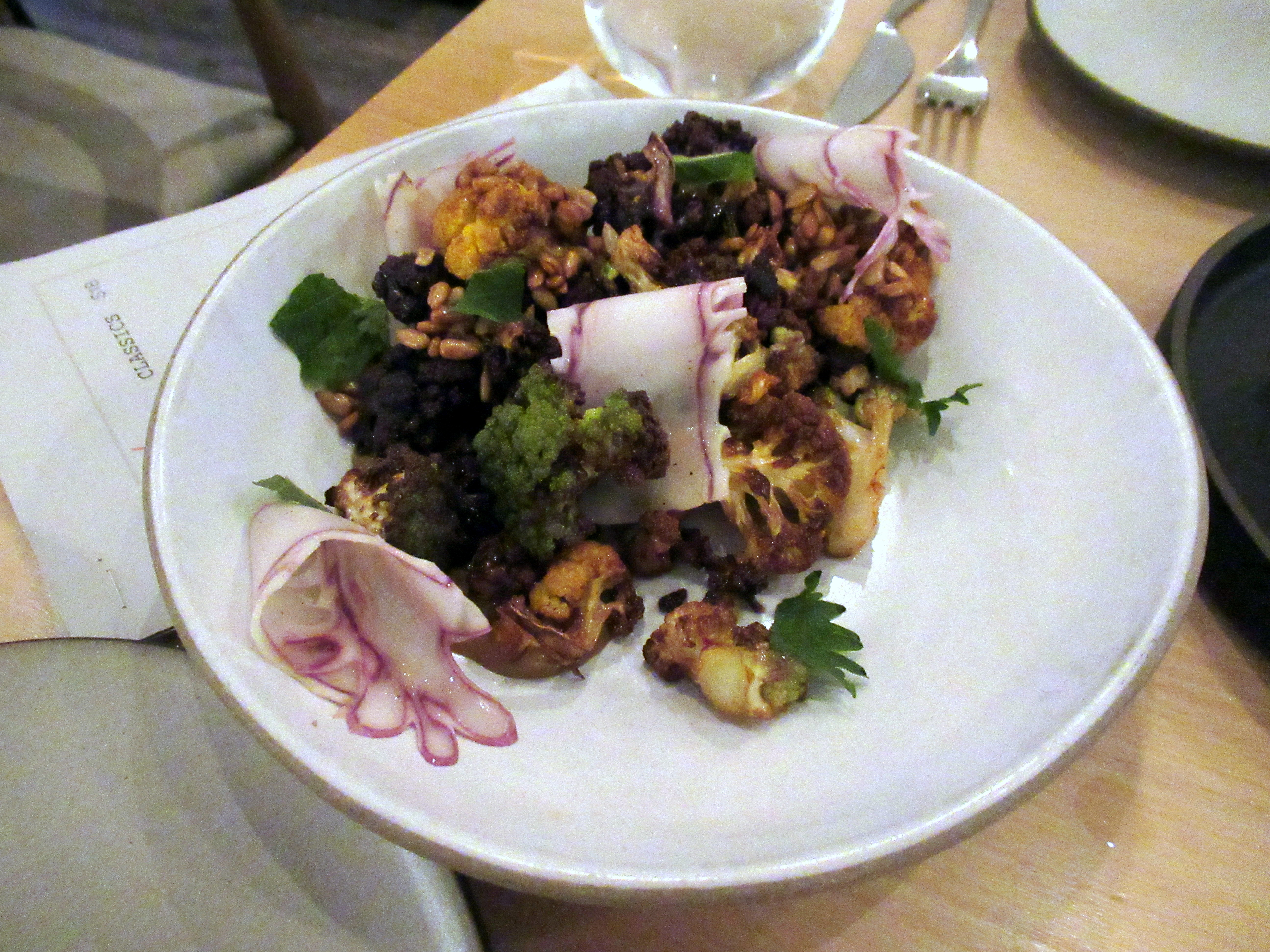 Roasted cauliflower with yuzu agro dulce, shiso, and sunflower seeds.