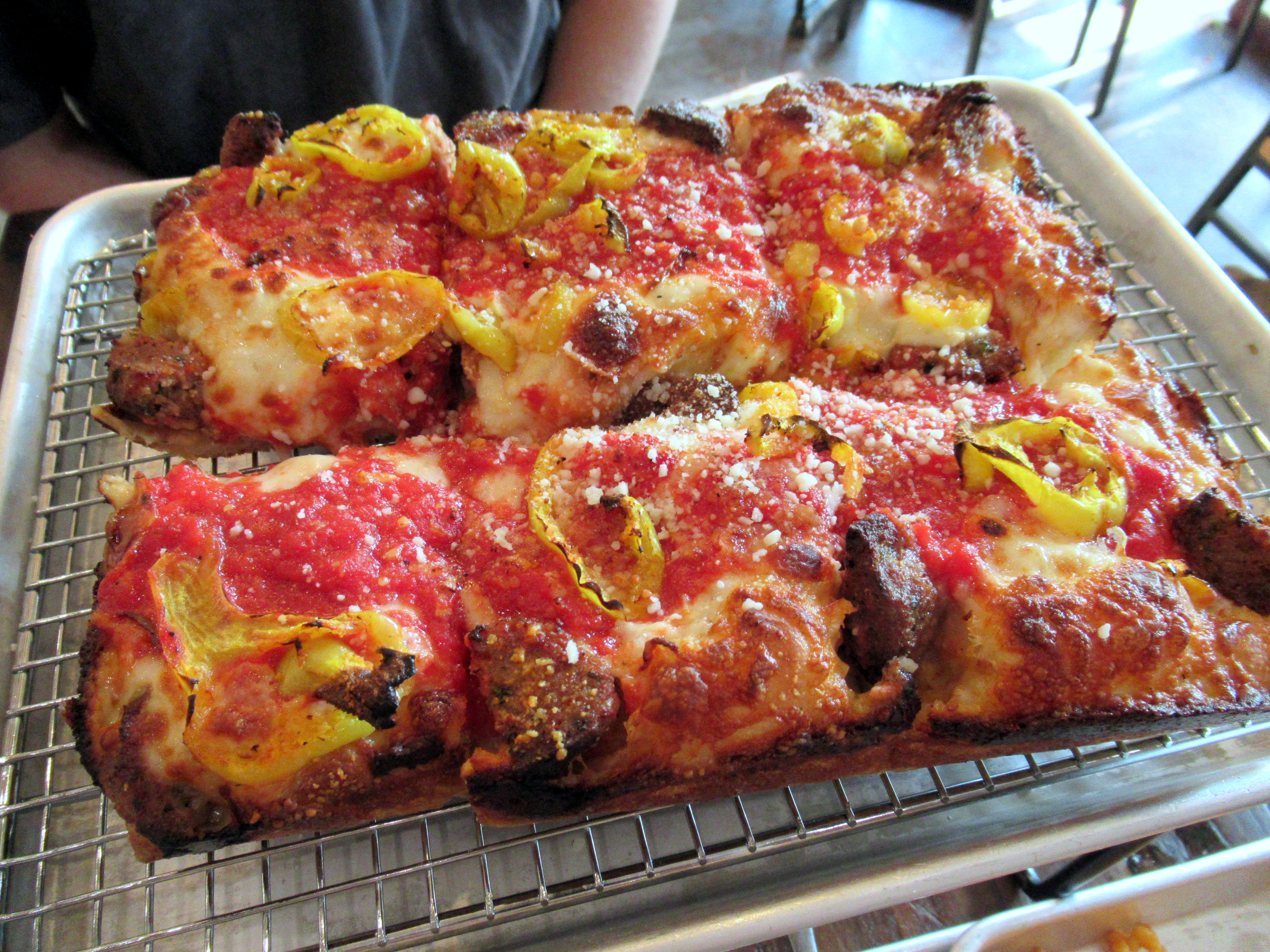 We also got a pizza with red sauce, meatballs, and banana peppers.