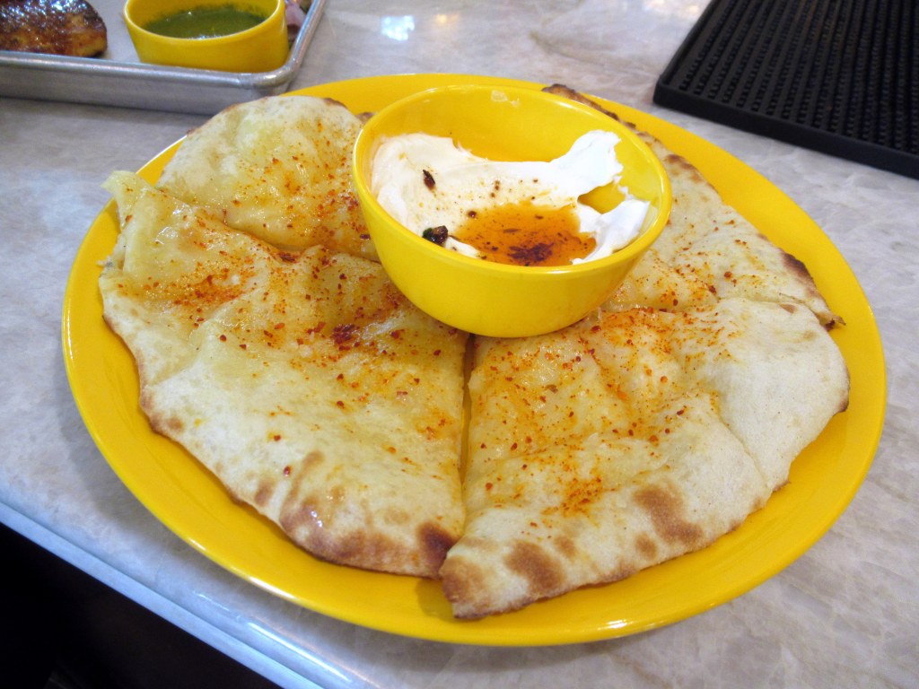 Housemade cheddar naan with a yogurt dipping sauce. <– so good!