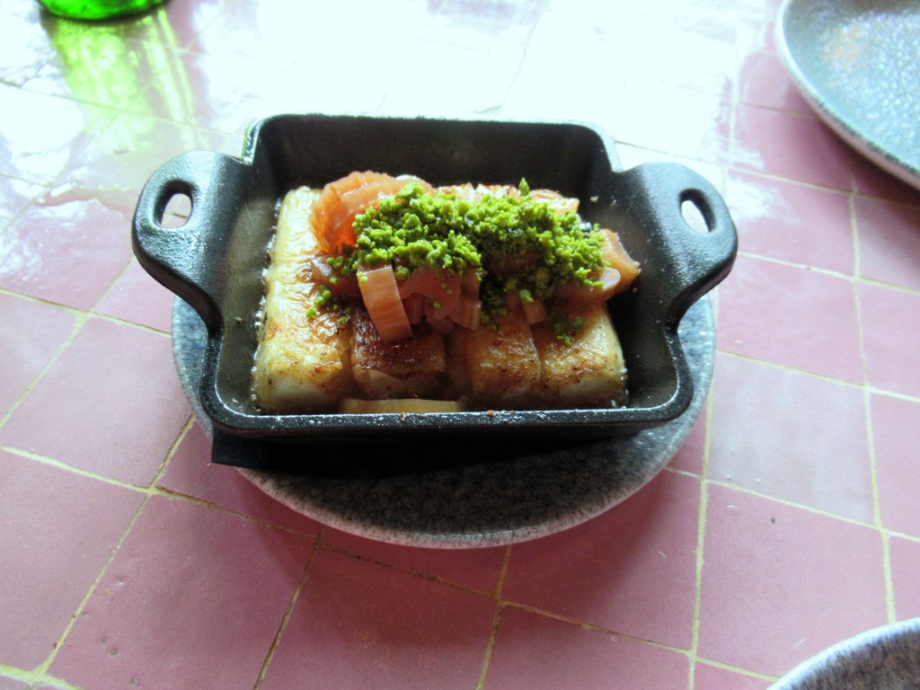 Savory baklava with haloumi, rhubarb, and pistachio.