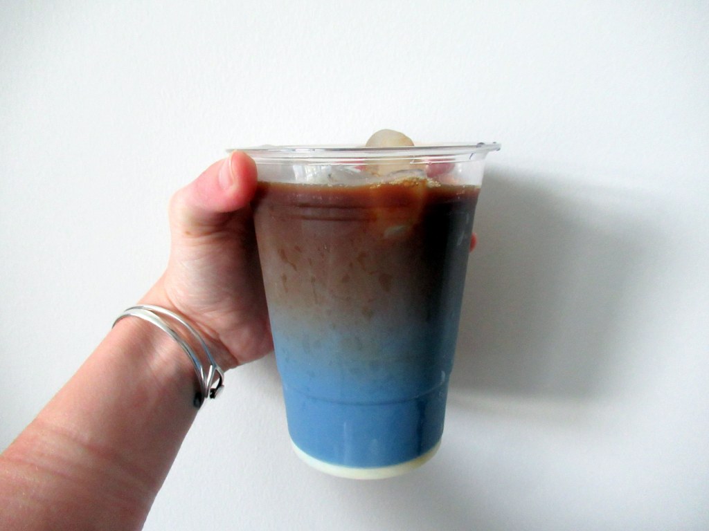 A beautiful latte with espresso, butterfly pea tea, and sweetened condensed milk.