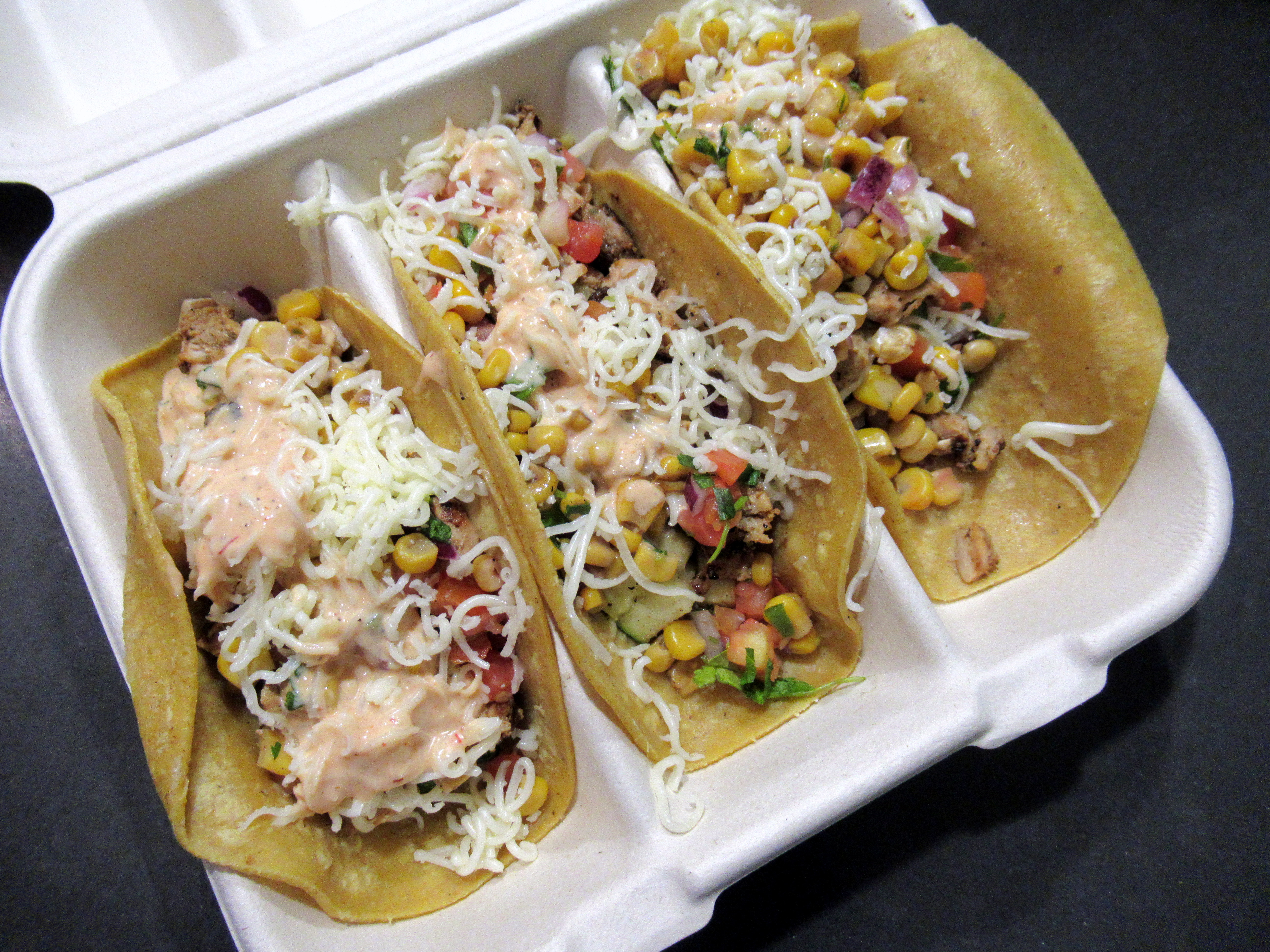 Chicken tacos from Burrito Blvd – with zucchini, tomato, roasted corn, cheese, and chipotle aioli.