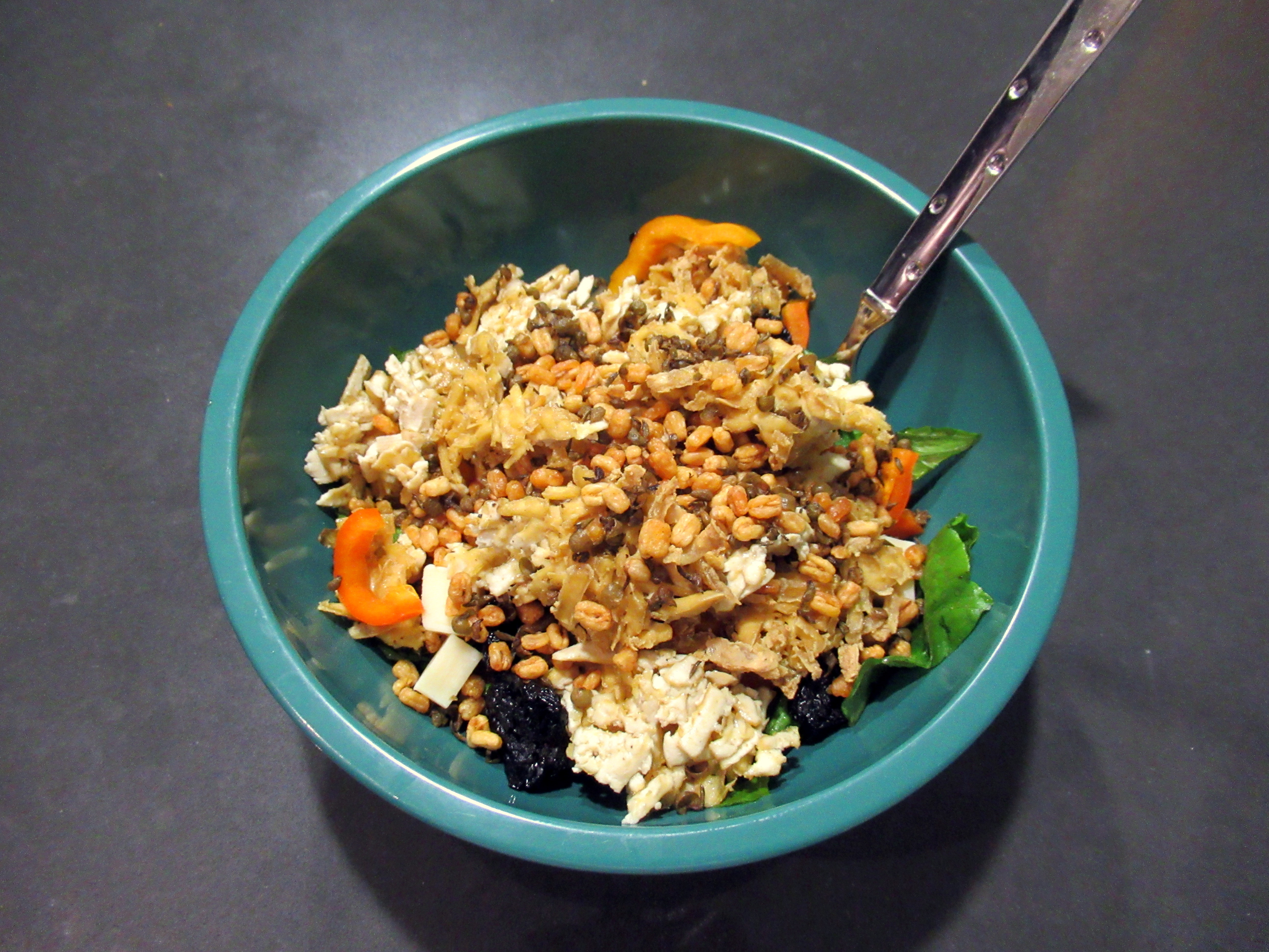 Salad night. Romaine / baby bell peppers / Trader Joe’s strawberry basil vinaigrette / Beecher’s Flagship cheddar / dried cherries / bacon-seasoned crunchy mung beans / super-firm tofu that I shredded; tossed with canola oil, white pepper, and Sichuan pepper salt; and roasted.