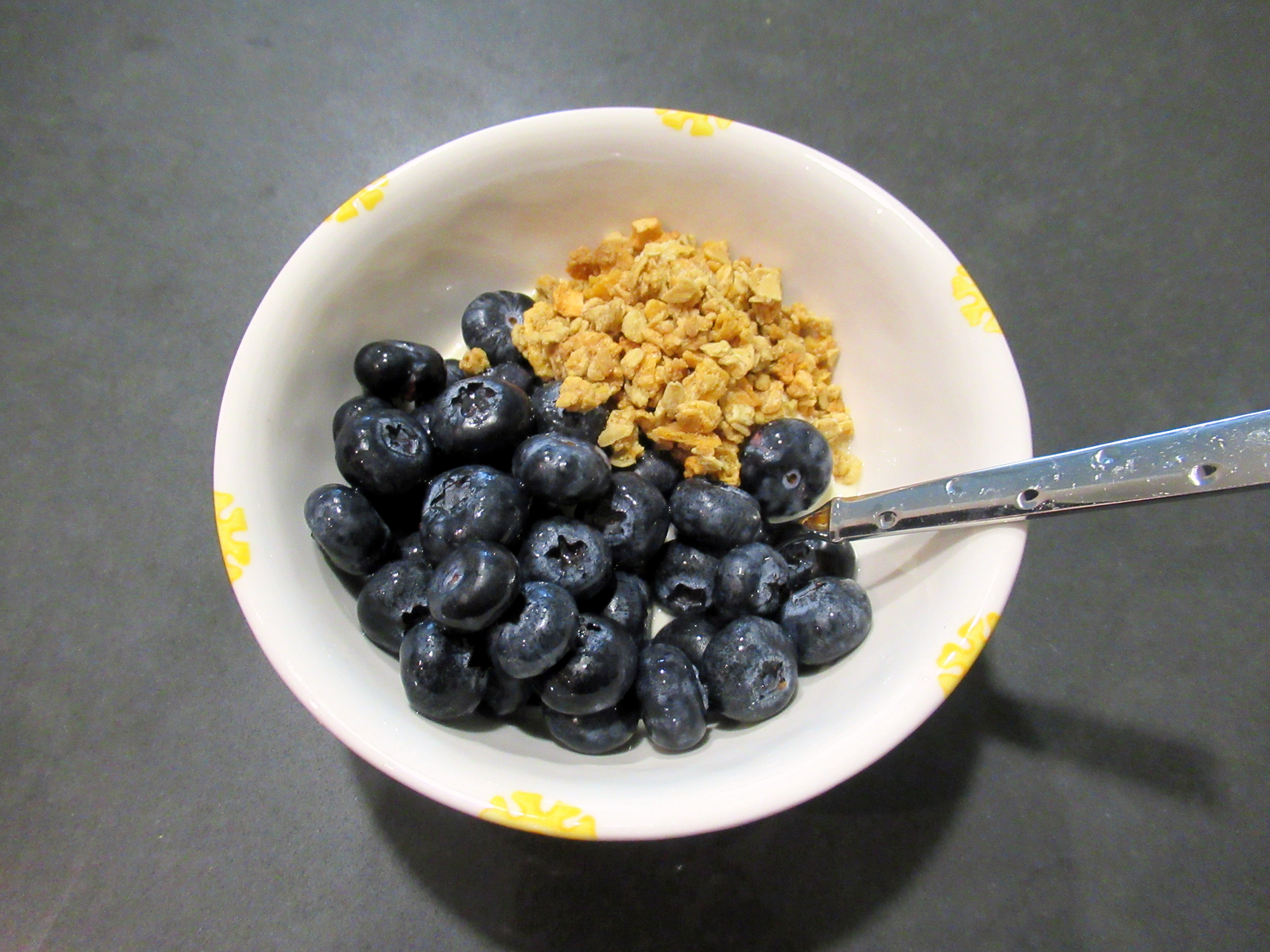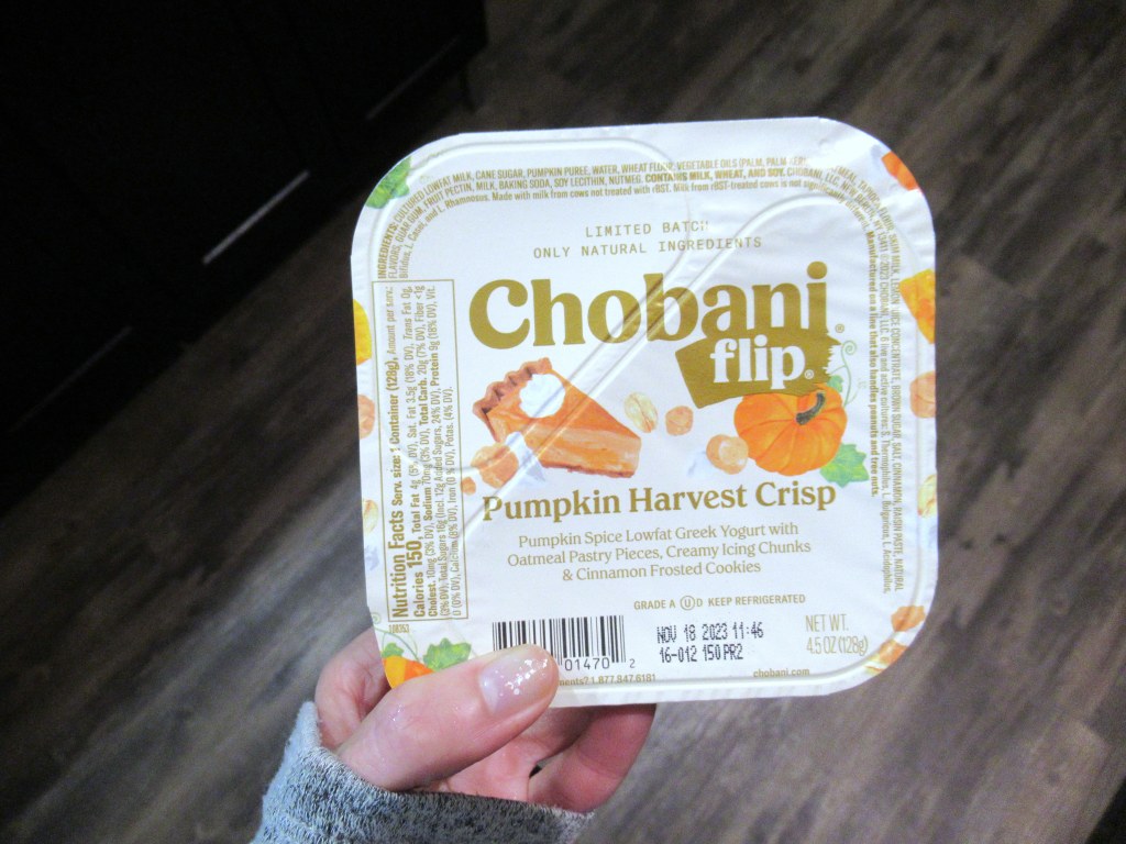 Chobani pumpkin spice Greek yogurt with caramel apple granola and jumbo blueberries.