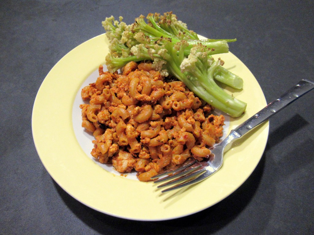 Spicy pumpkin pasta. Whole-wheat elbows with sauteed ground turkey with sour cream, pumpkin puree, and chili crisp. Plus roasted baby cauliflower.