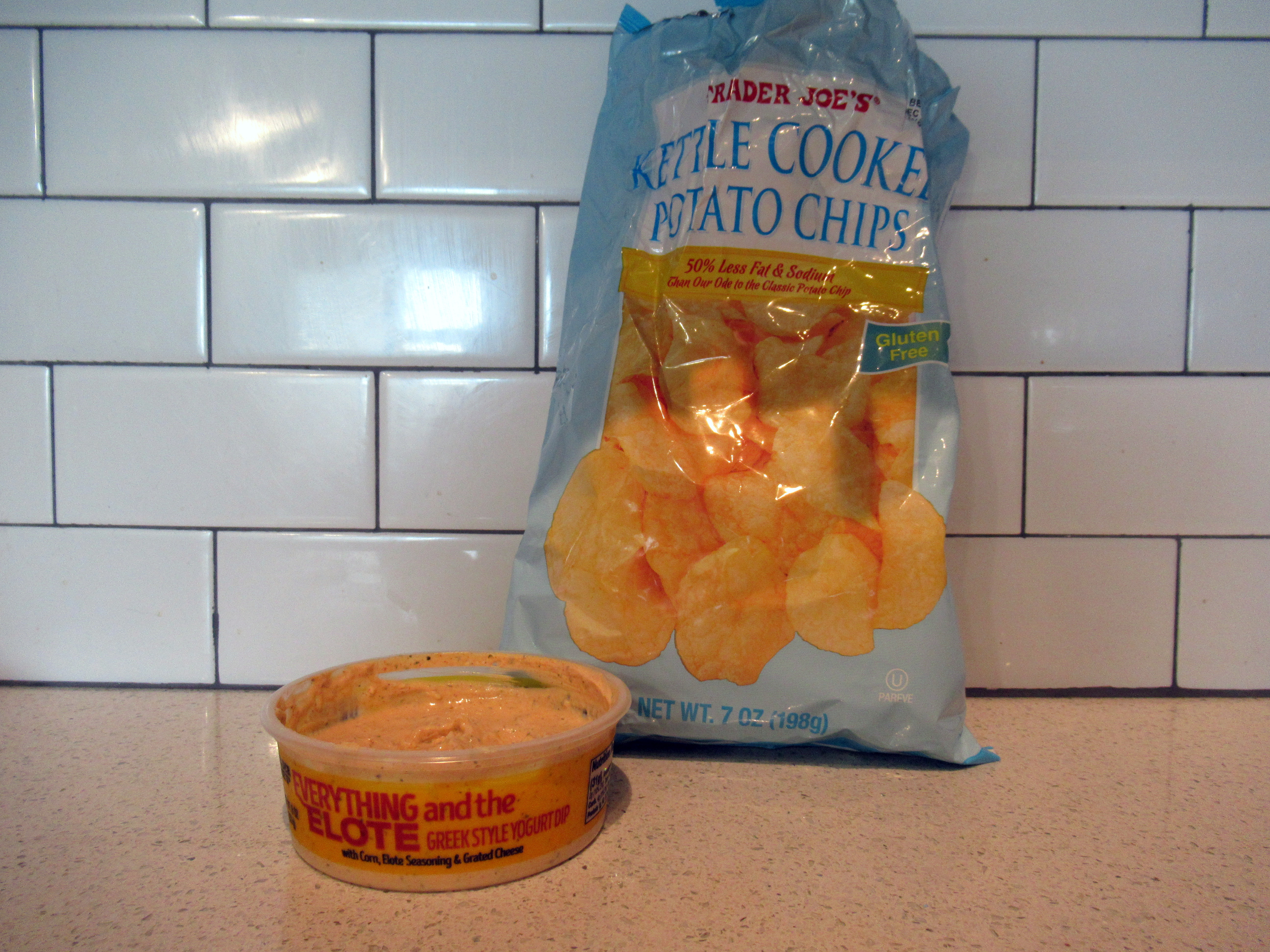Cocktail chip hour a la Trader Joe’s – their best potato chips with everything and the elote dip.