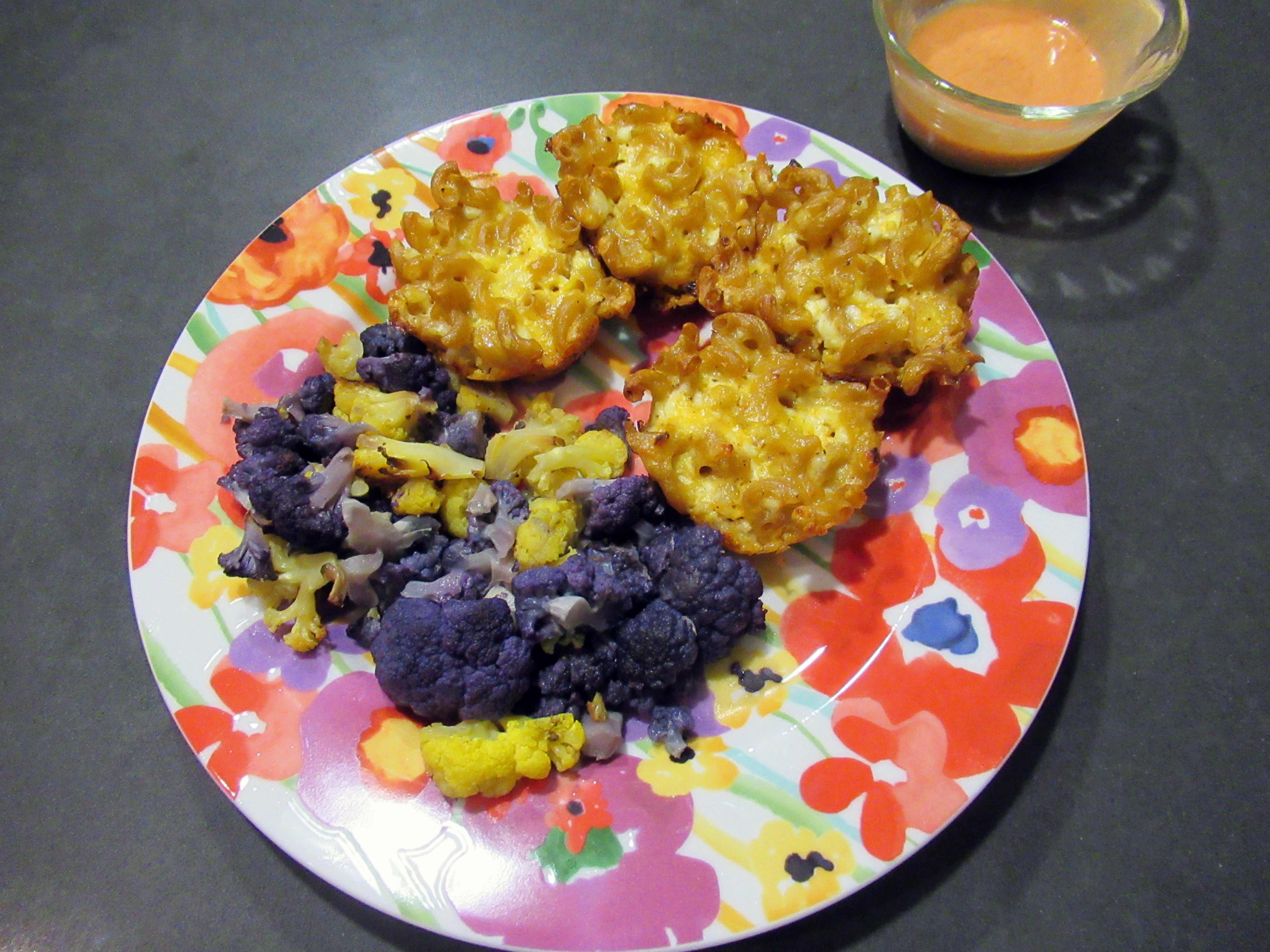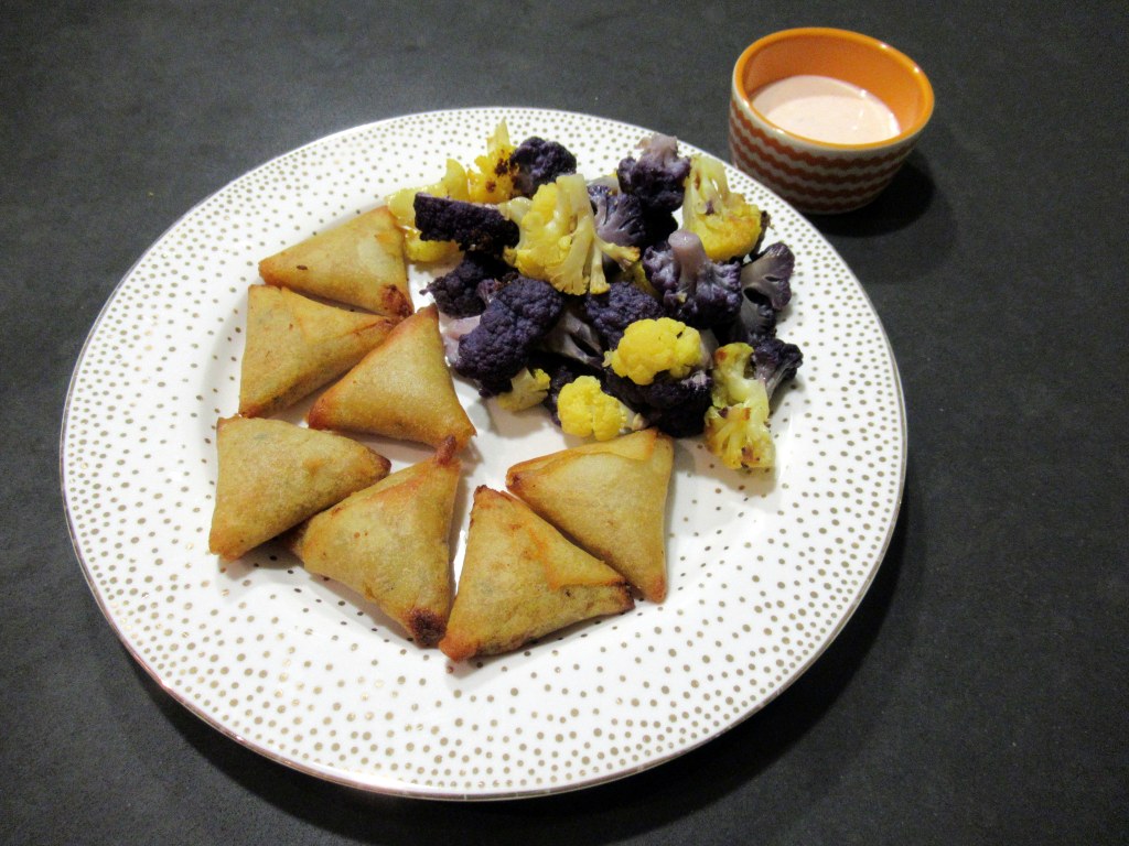 Trader Joe’s spicy pumpkin samosas (11/10!) with roasted orange and purple cauliflower. I made a dipping sauce with sour cream, maple, harissa, and lime.