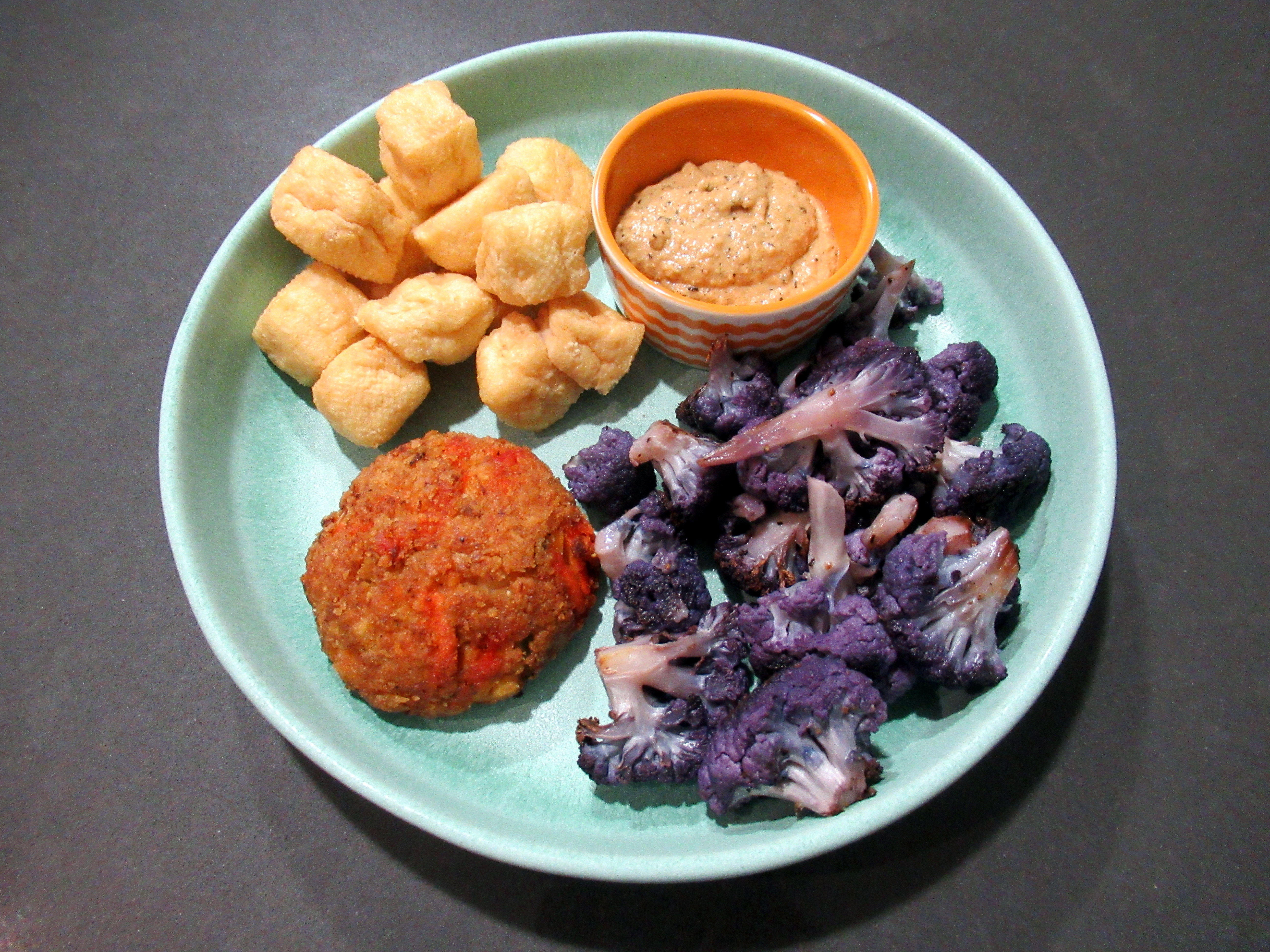 Fried mini tofu, Sea For Yourself bechamel and sherry lobster cake, roasted purple cauliflower, and a toasted miso sesame dipping sauce (in a saucepan over low heat – canola oil, miso, tahini, urfa pepper; whisked with mayo and a squeeze of lemon).
