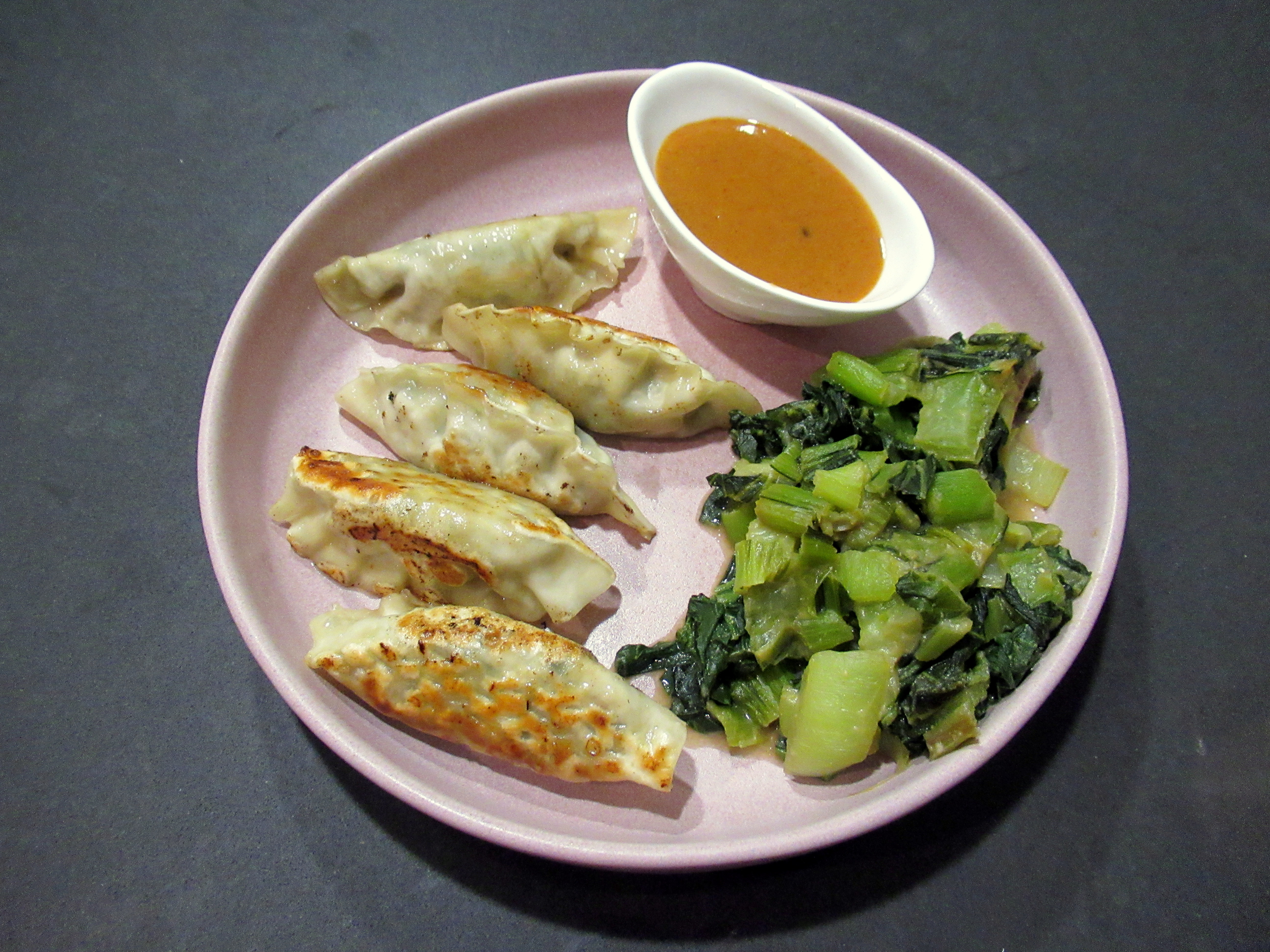 Bok choy sauteed with miso and ginger and Mandu chicken and vegetable dumplings. Plus a spicy peanut dipping sauce (for 2 big servings – 2 Tbsp peanut butter, 2 Tbsp hot water, 1/2 tsp brown sugar, heaping 1/2 tsp Sriracha, 1/2 tsp soy sauce, 1/2 tsp rice vinegar).