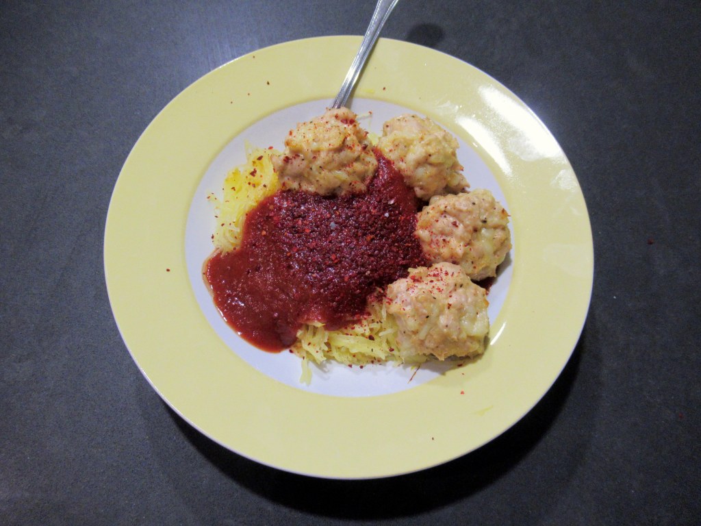 Roasted spaghetti squash with baked turkey meatballs (stuffed with panade, tons of garlic, urfa pepper, and cheese). Plus Trader Joe’s pizza sauce and chili flakes.