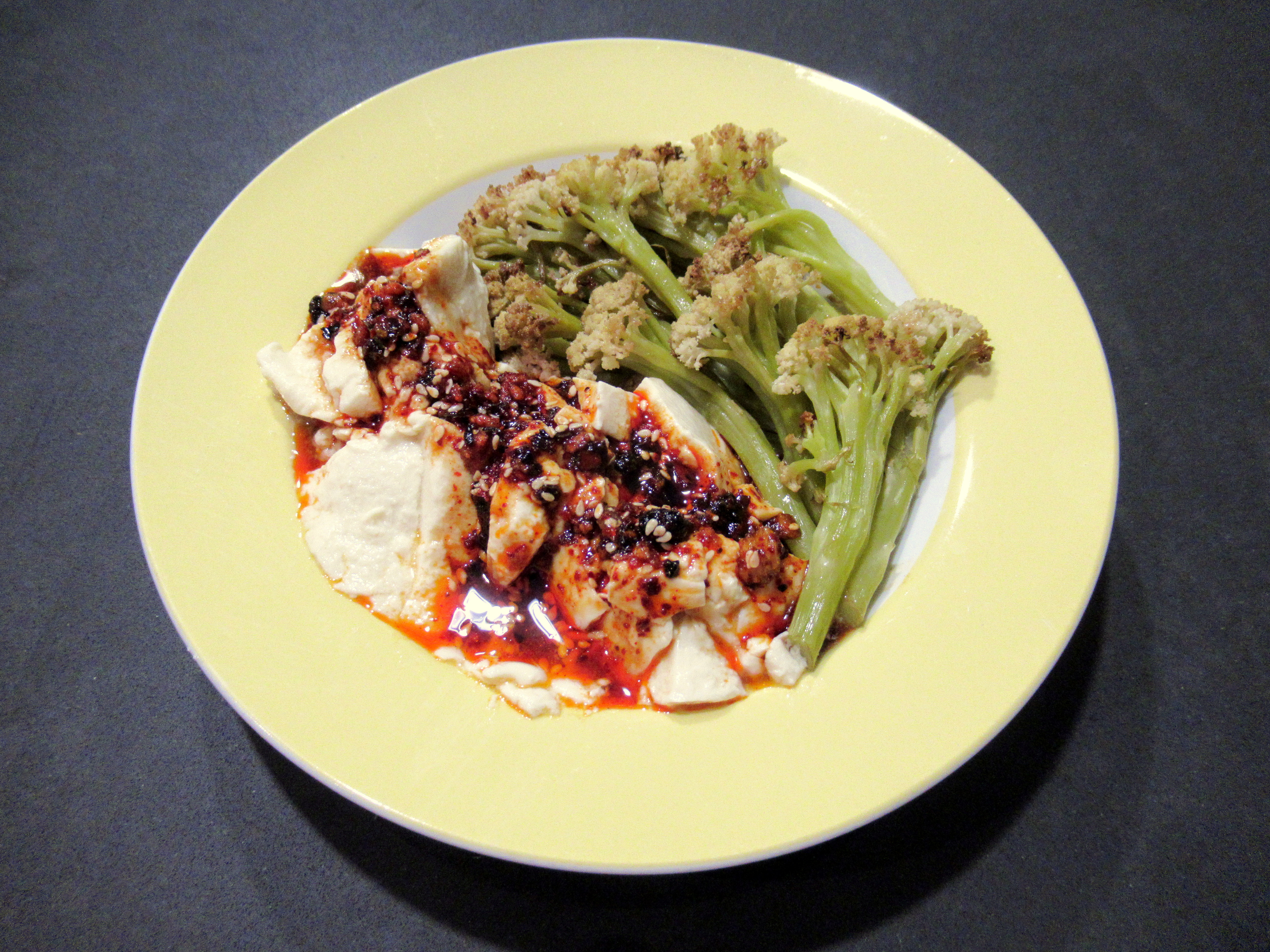 Hot/cold tofu. Cold silken tofu topped with a mix of soy sauce, rice vinegar, sugar, chili crisp, gochugaru, sesame seeds, and furikake. Plus roasted baby cauliflower.