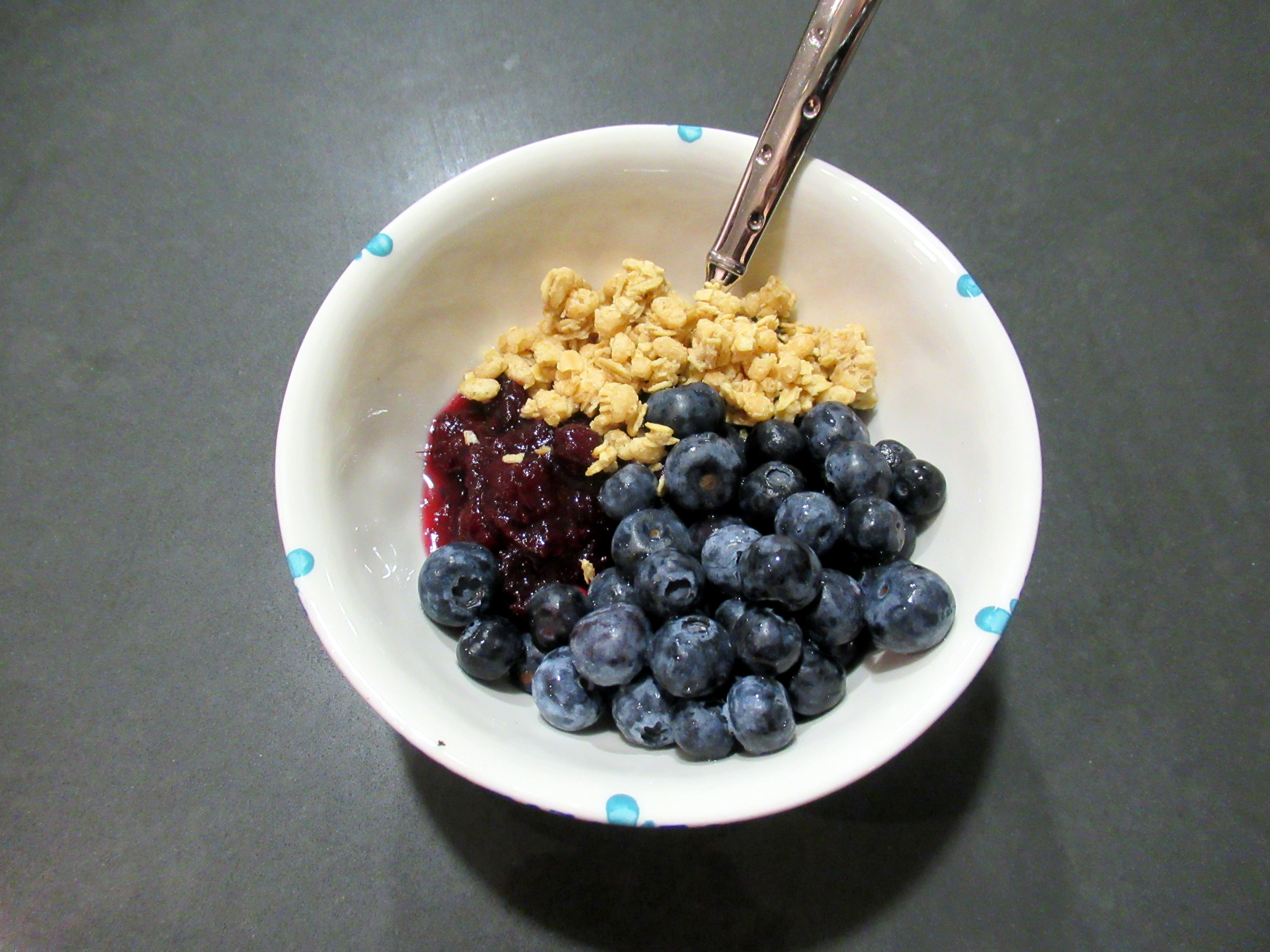 Plain skyr with blueberries, leftover cranberry sauce, and Target sugar cookie granola.