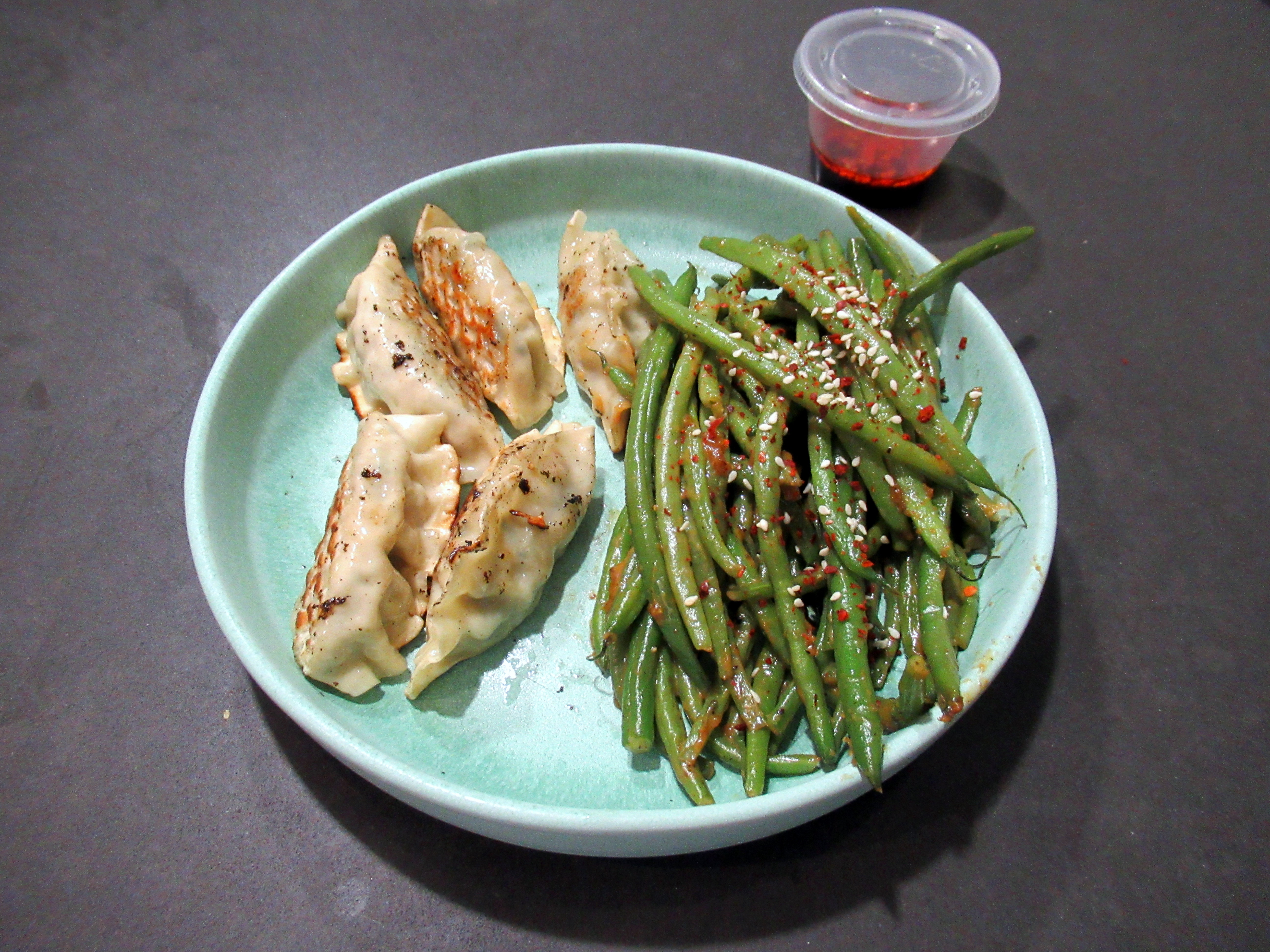 Chicken and veggie dumplings from Mandu (the best!) the best with spicy sesame miso green beans (steamed, then sauteed in a mix of lime juice, brown sugar, gojuchang, miso paste, tahini, and water) and leftover tofu sauce.