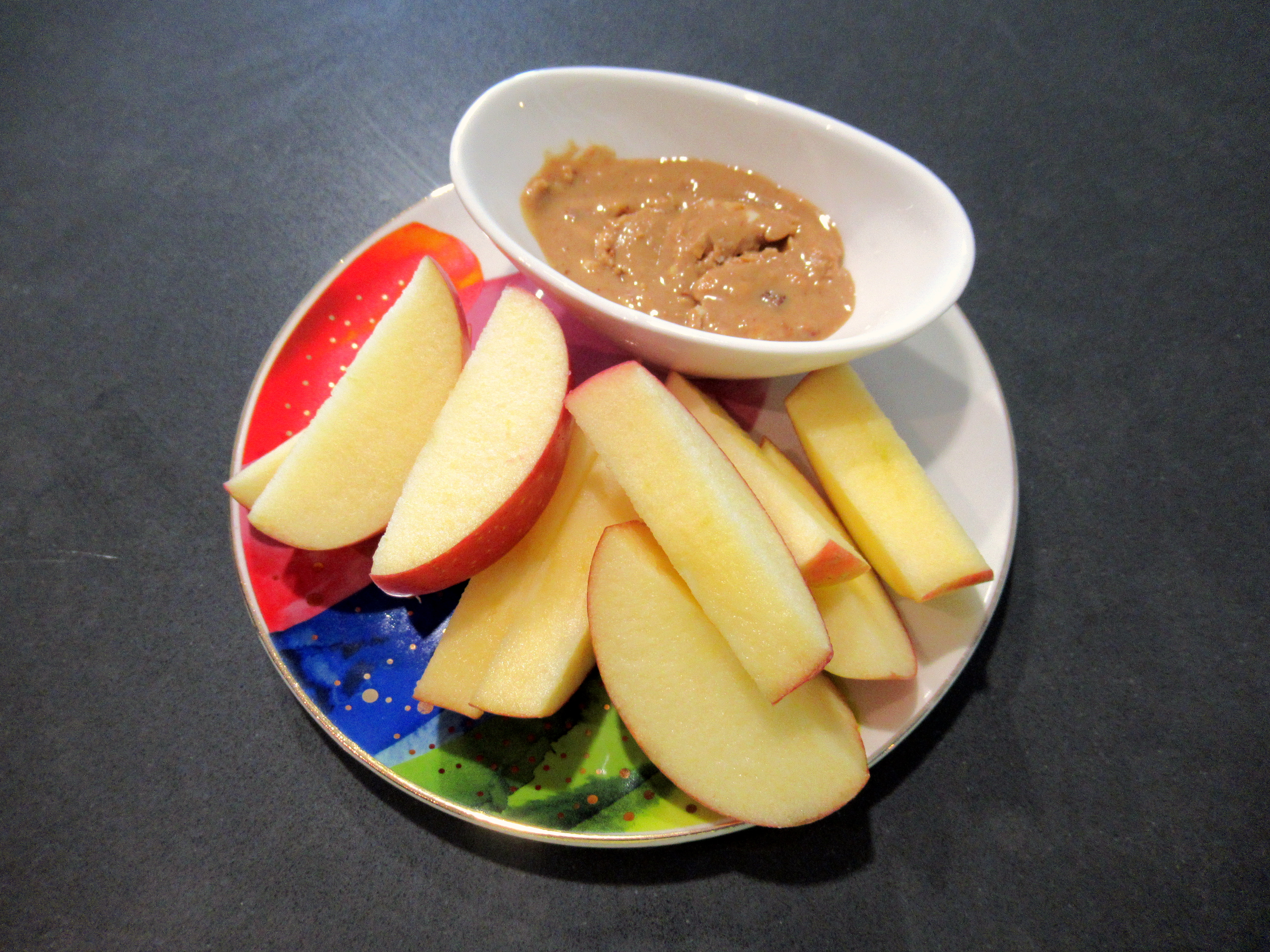 After-school snacks. Apple + peanut butter (I didn’t have mini marshmallows to make smiles!). This was a Sugar Bee apple and it was wonderfully crisp and sweet.