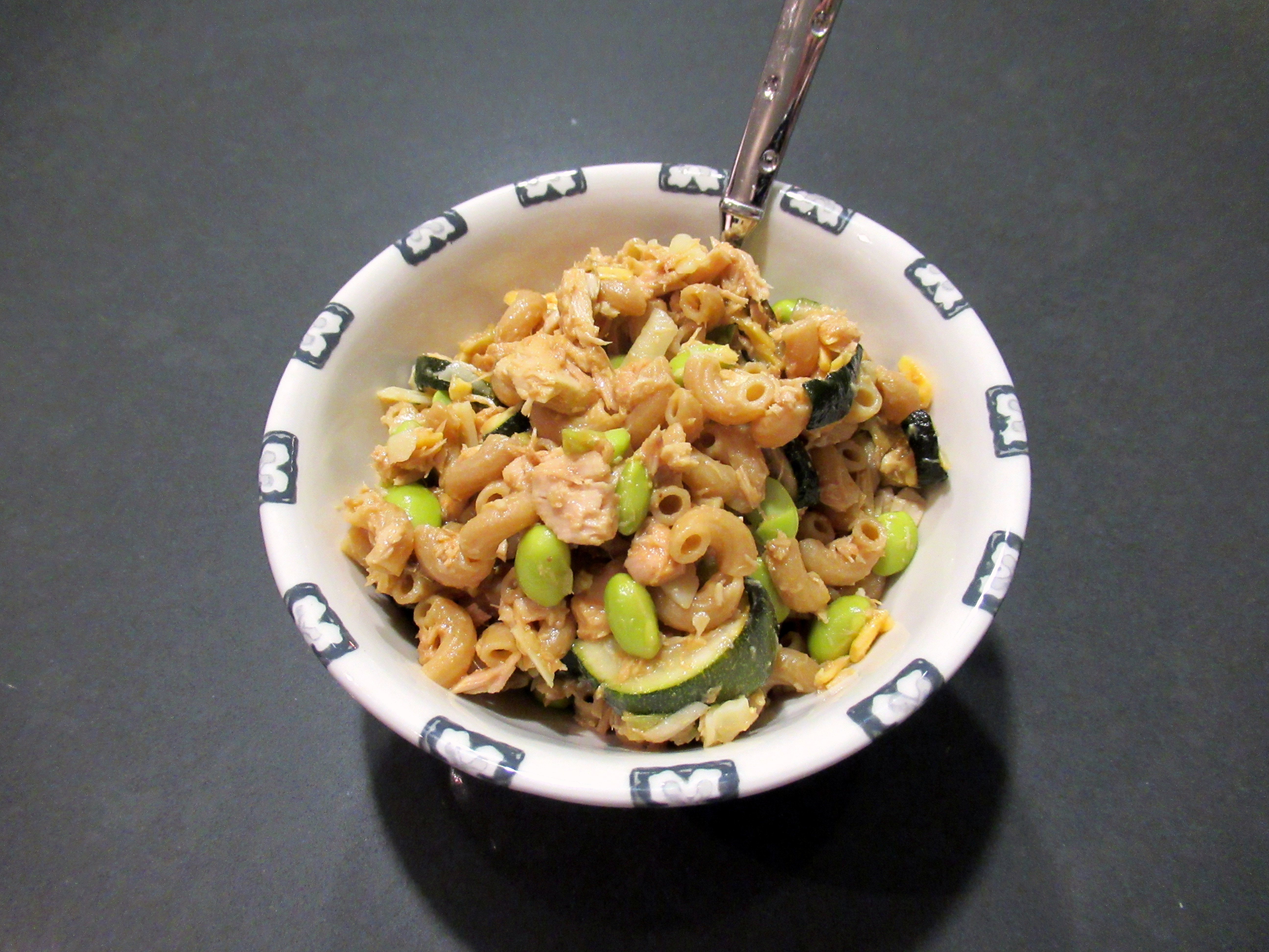 I did not use Italian dressing in my tuna pasta though that is how I grew up eating it. Whole-wheat macaroni, canned tuna, roasted zucchini, edamame, extra-sharp cheddar, and balsamic vinegar. Maybe Italian is the way to go though? Adam and I both went back and topped our bowls with hot sauce.