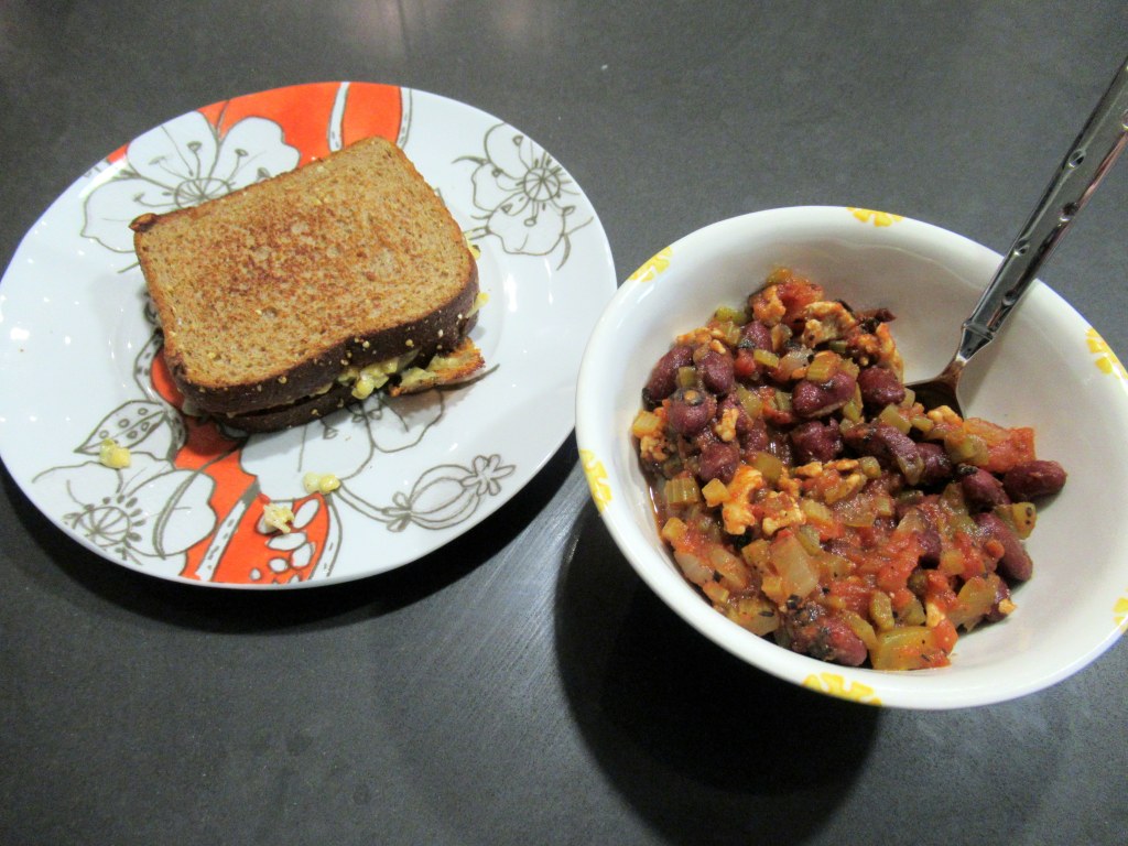 Chili = ground turkey, celery, white onion, fire-roasted tomatoes, fire-roasted green chiles, kidney beans, chicken broth, evoo, salt, pepper, and smoked paprika. I topped my bowl with plain yogurt and hot sauce. Plus I made amazing grilled cheese sandwiches; the filling was a mixture of extra-sharp cheddar, marinated artichoke hearts, mayo, white pepper, mustard powder, and a pinch of sugar.