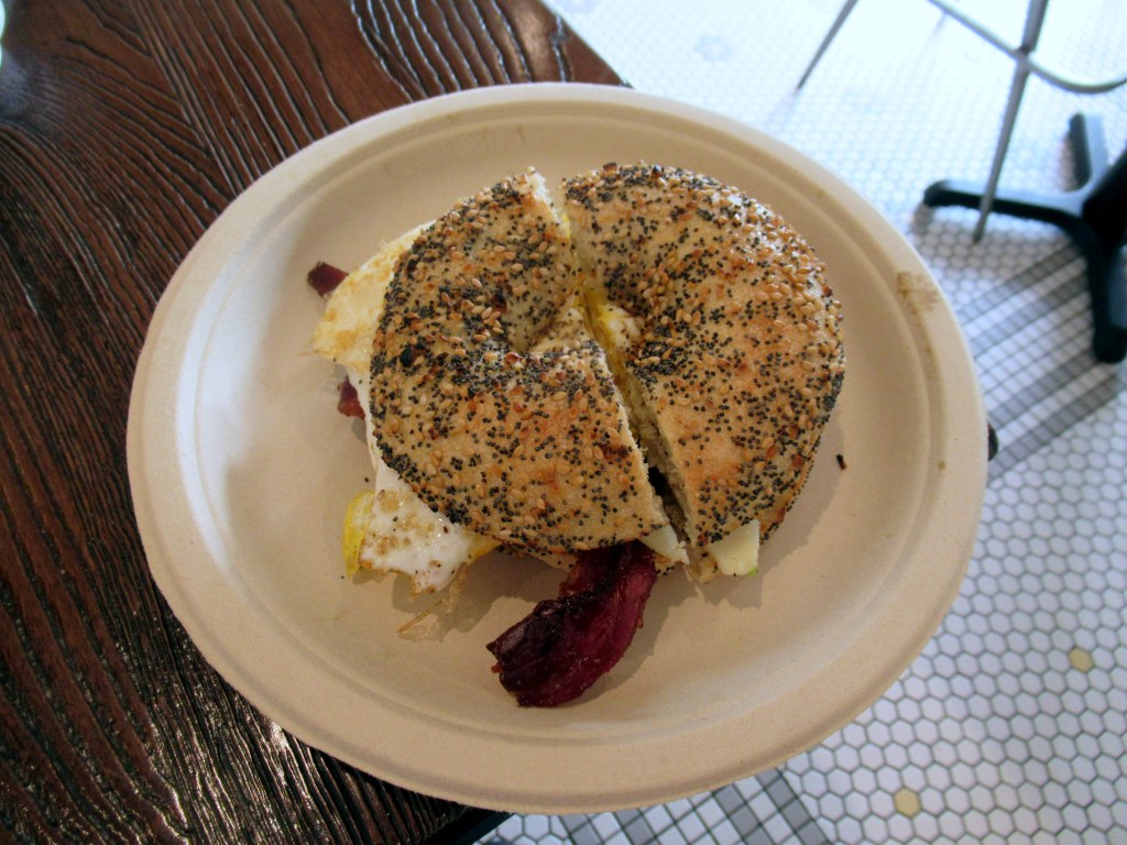 Orwashers. Adam and I split an everything bagel with fried egg, cheddar, and beef bacon.